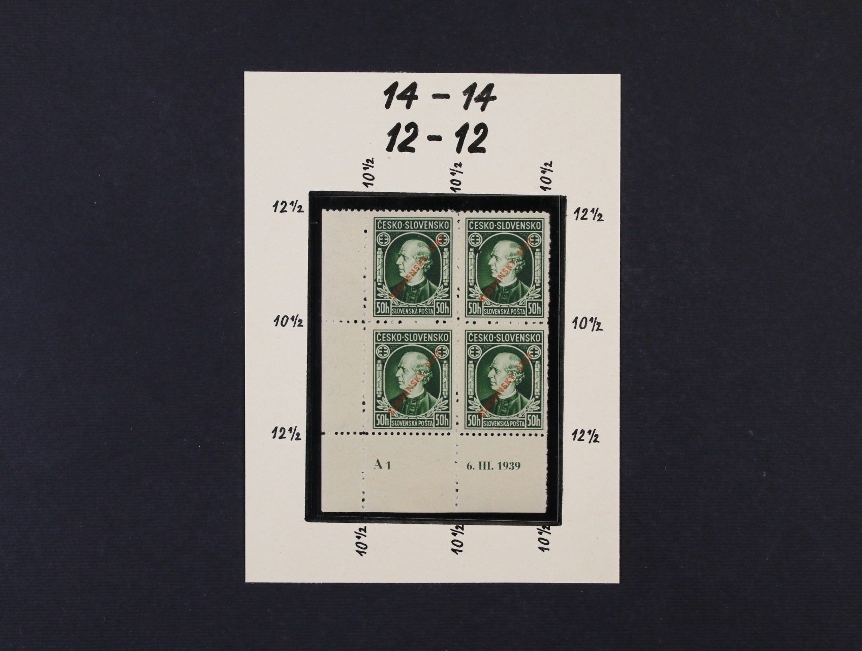 zn. č. 23 C - levý spodní roh. čtyřblok v kombinaci 14 - 14, 12 - 12 s DZ A 1 6.III.1939, zk. Slovenský filatelista, Ptačovský
