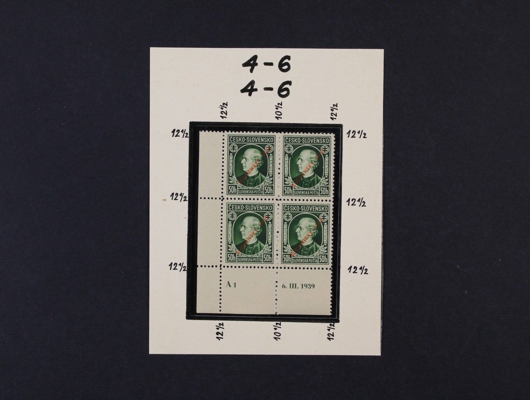 zn. č. 23 C - levý spodní roh. čtyřblok v kombinaci 4 - 6, 4 - 6, s DZ A 1 6.III.1939, zk. Slovenský filatelista, dvl.