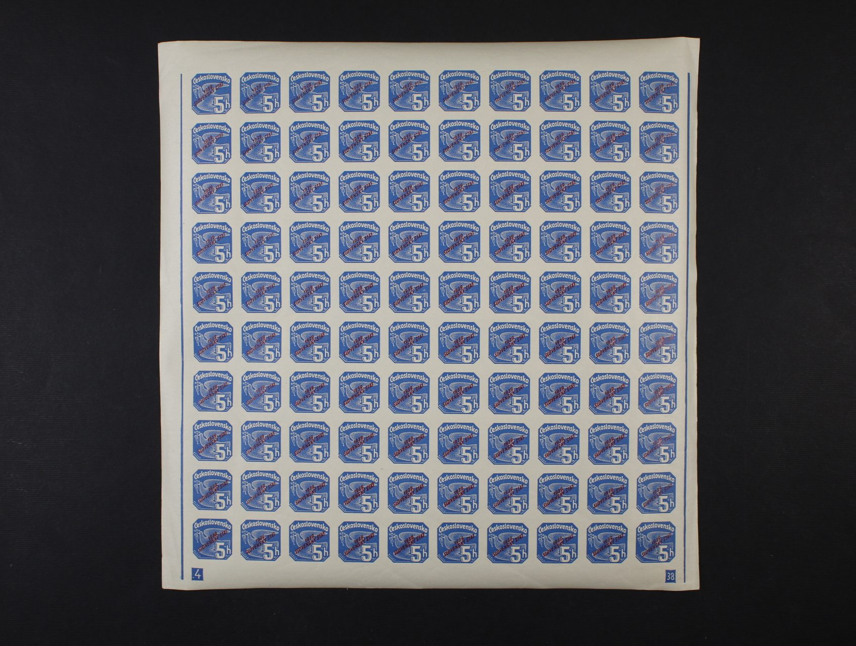 zn. NV č. 5 v kompl. 100kusovém archu vč. DV přetisku, částečný strroj. obtisk na lepu, přerušovaný ochr. rám, DZ 3-37