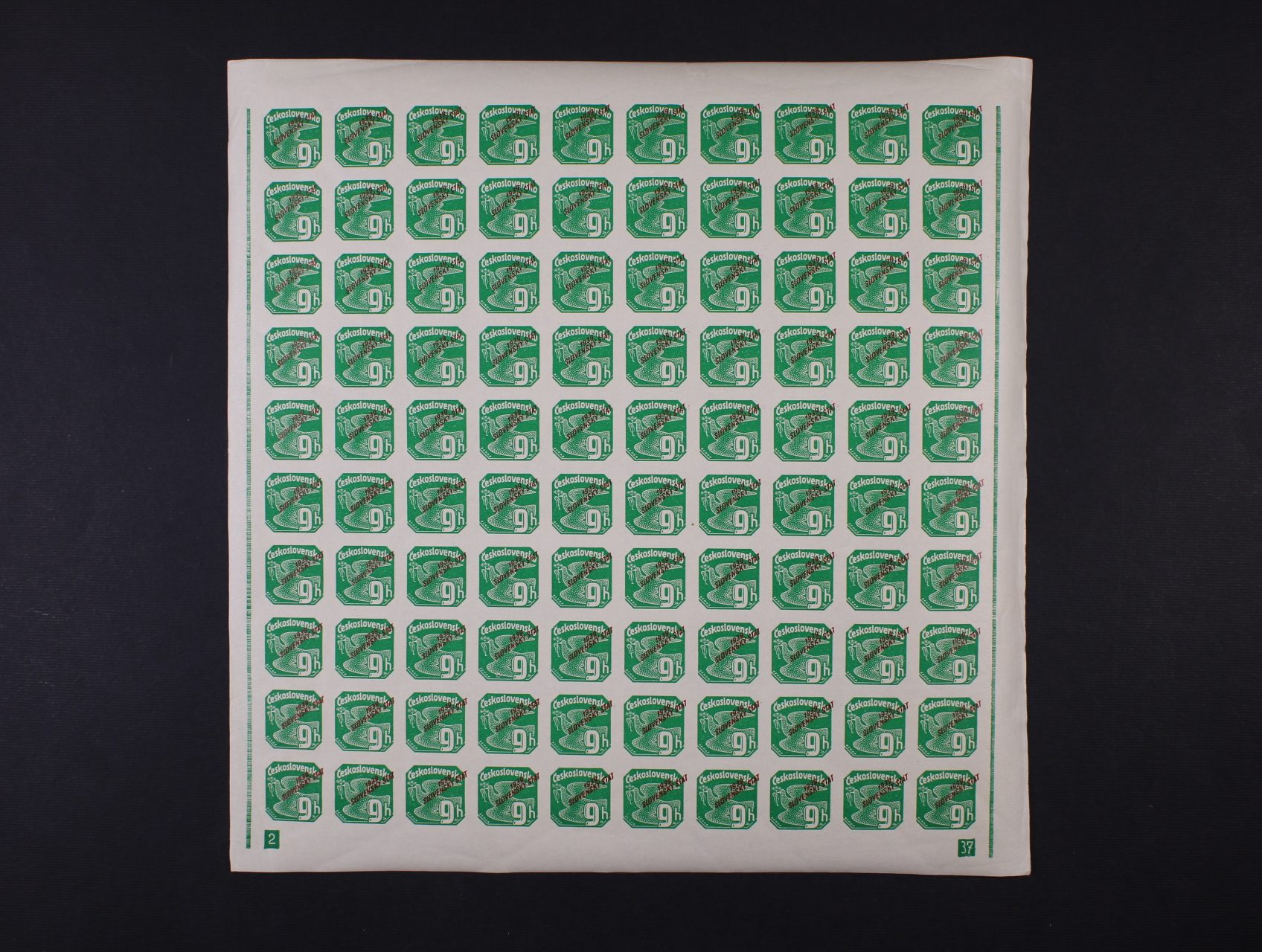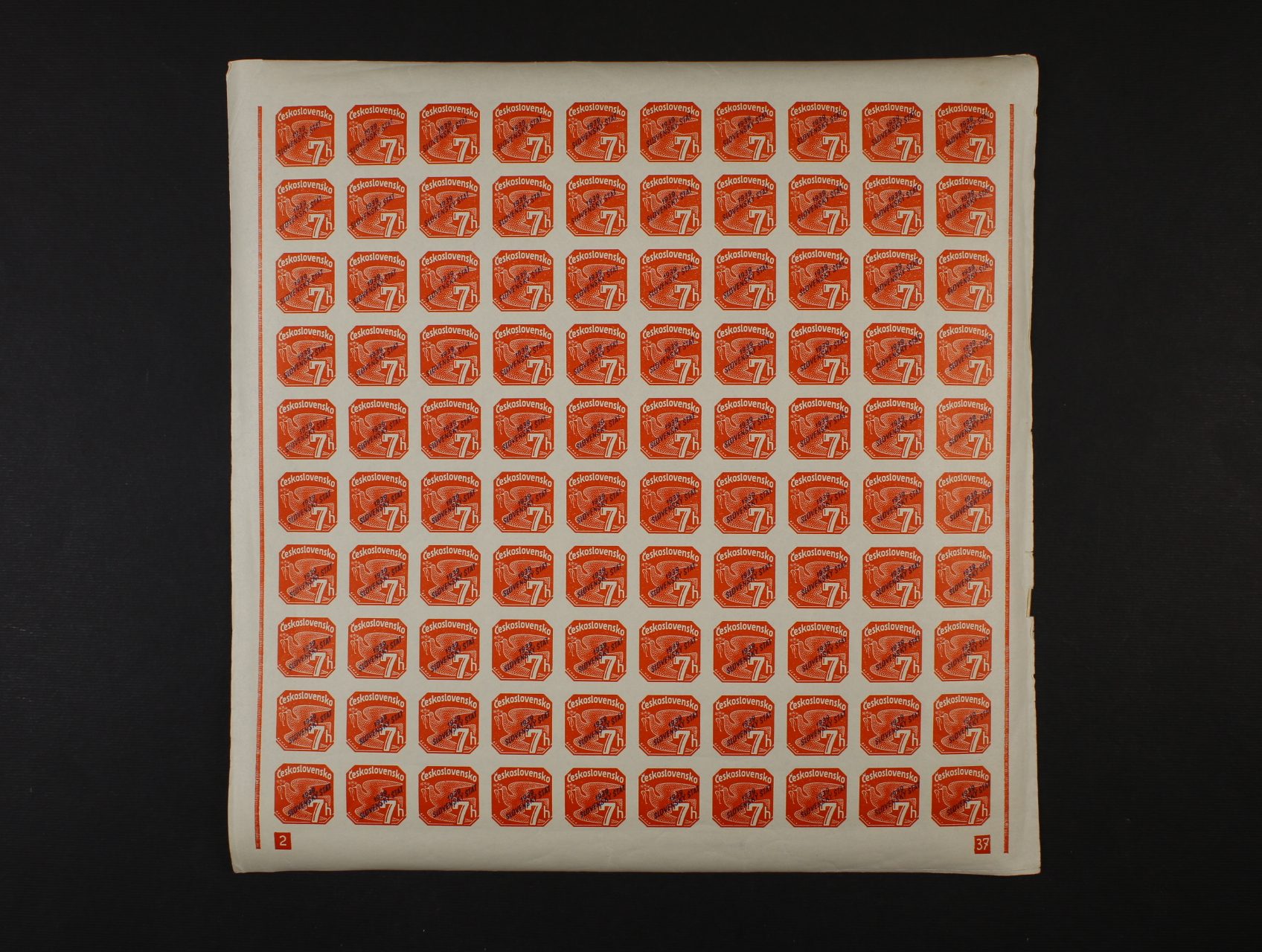 zn. NV č. 2 v kompl. 100kusovém archu vč. DV přetisku, nepřerušený ochr. rám, DZ 4-38