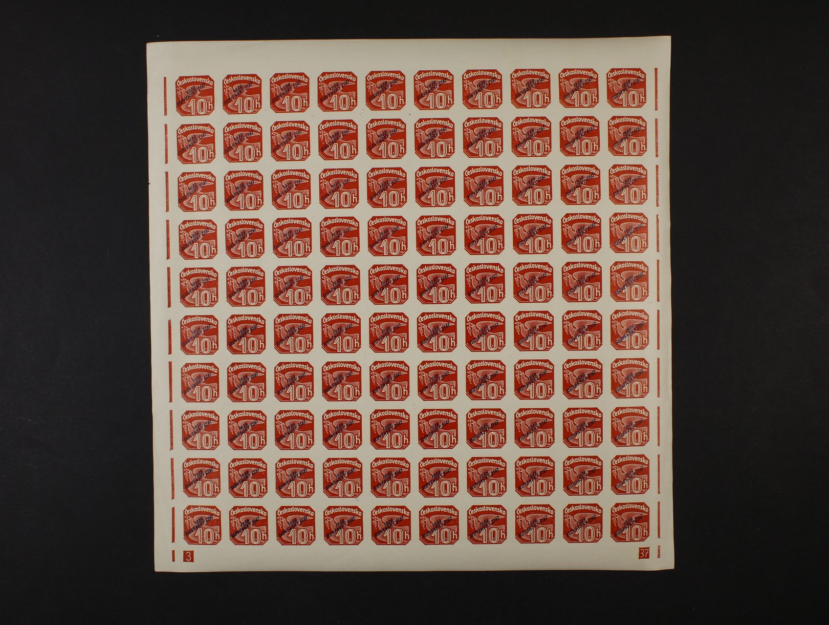 zn. NV č. 3 v kompl. 100kusovém archu s DV přetisku, nepřerušený ochr. rám, DZ 2-37, poprvé v aukci