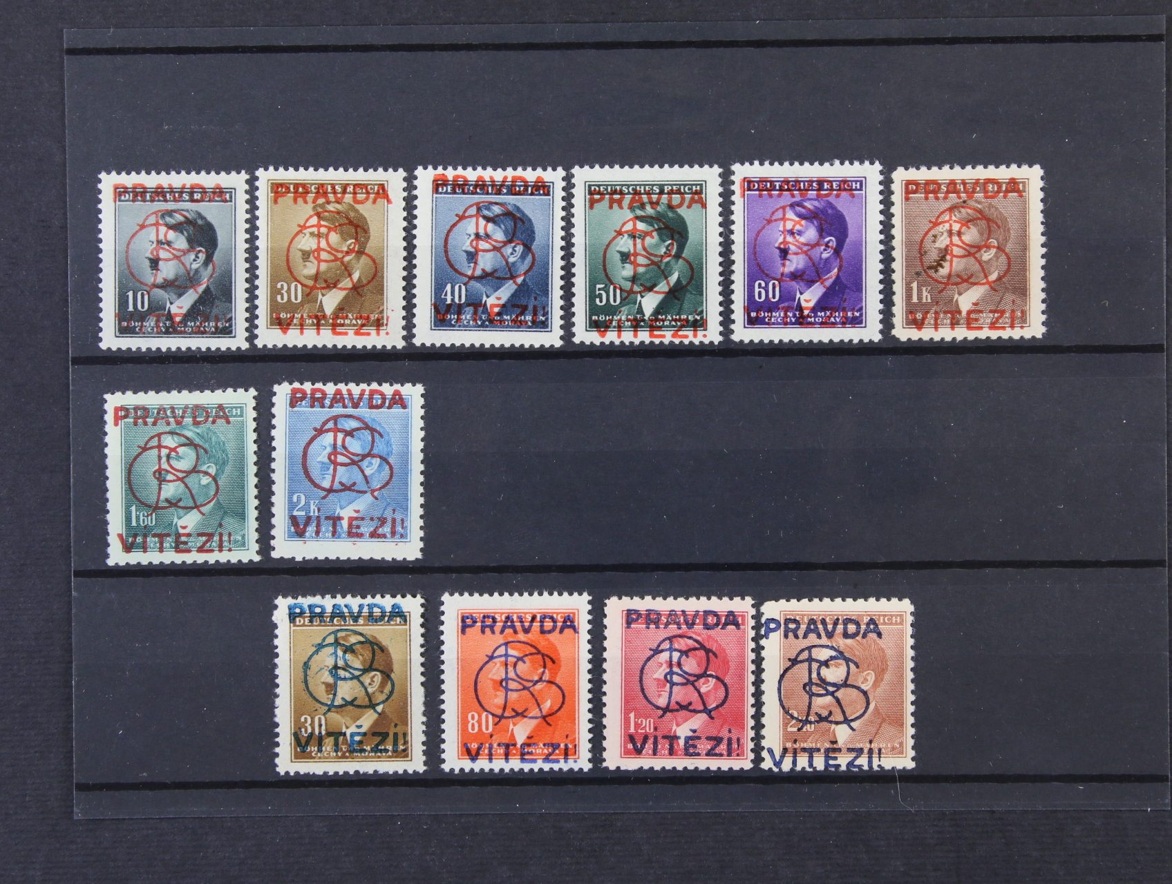 Praha - Smíchov I. "Poselt" - sestava 12ks protektor. zn. A. H., modrý a červený přetisk, bez jedné zn. kompletní vydání, 1 zn. s nálepkou a 1 zn. dvl