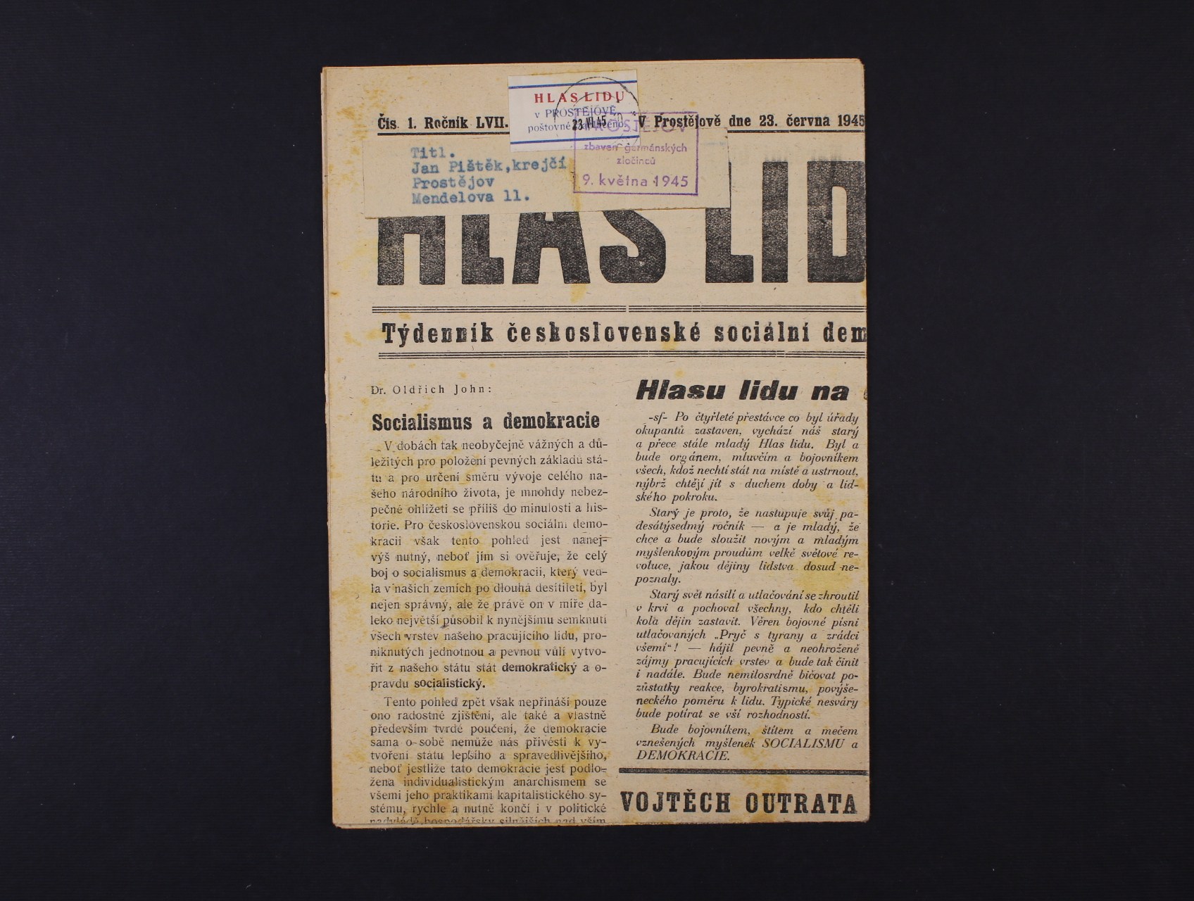 Prostějov - kompl. noviny Hlas lidu s proviz. nálepkou HLAS LIDU v PROSTĚJOVĚ poštovné zaplaceno s datací 23.5.45, příd. rámeč. raz. PROSTĚJOV zbaven germánských zločinců