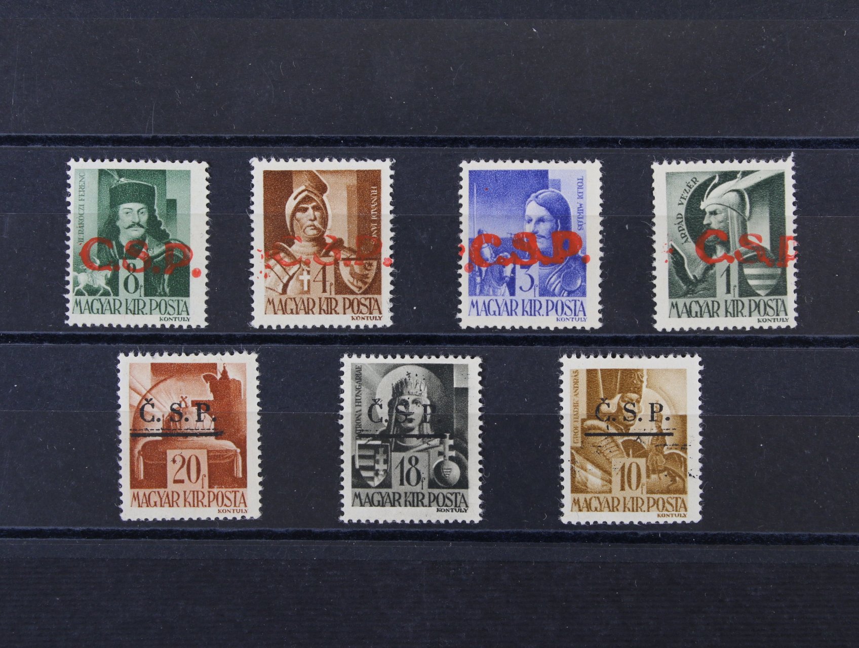 Rimavská Sobota - čtyři maď. zn. (1f, 3f, 4f a 5f s červeným přetiskem ČSP.), zk. Blaha, Rožňava - tři zn. s černým přetiskem Č.S.P.