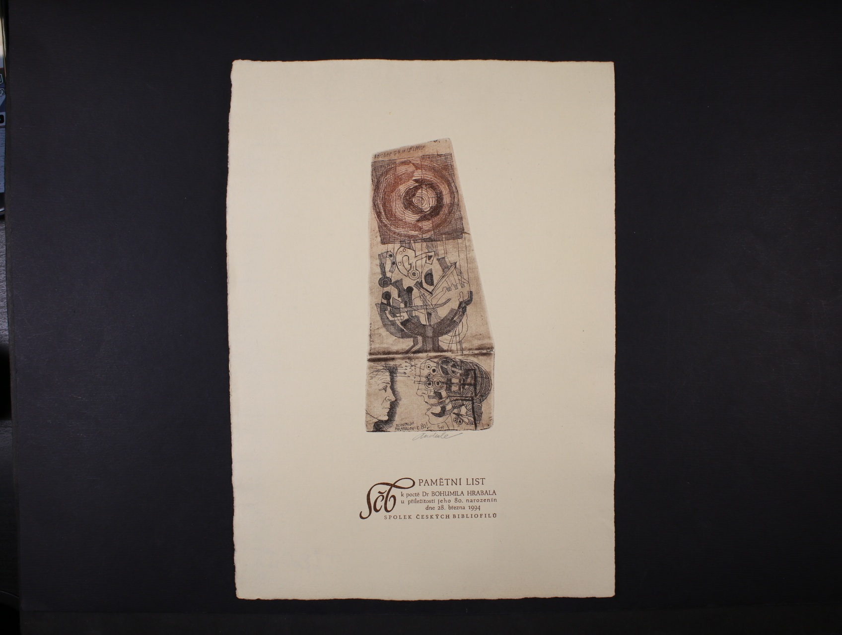 Drobná grafika - pam. list (ocelorytina) formátu A4 k poctě Bohumila Hrabala u příležitosti jeho 80tých narozenin 28.3.1994, autor Andrle Jiří, akad. malíř, spisovatel, grafik a jeho vlastnoruční podpis