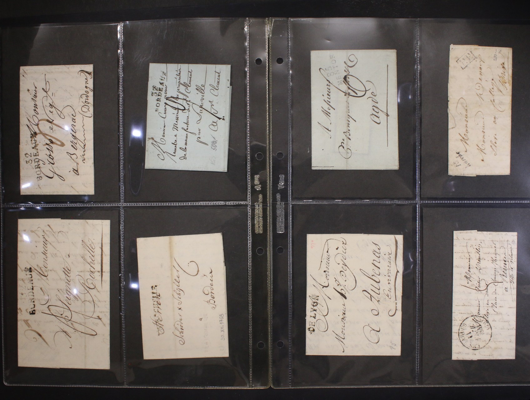1569 sestava 16 ks předzn. dopisů z let 1770 - 1842 s různými raz., mj. řádkové červené CHAUMONT, VALOGNES, černé řádk. raz. BORDEAUX, DE LYON 1500