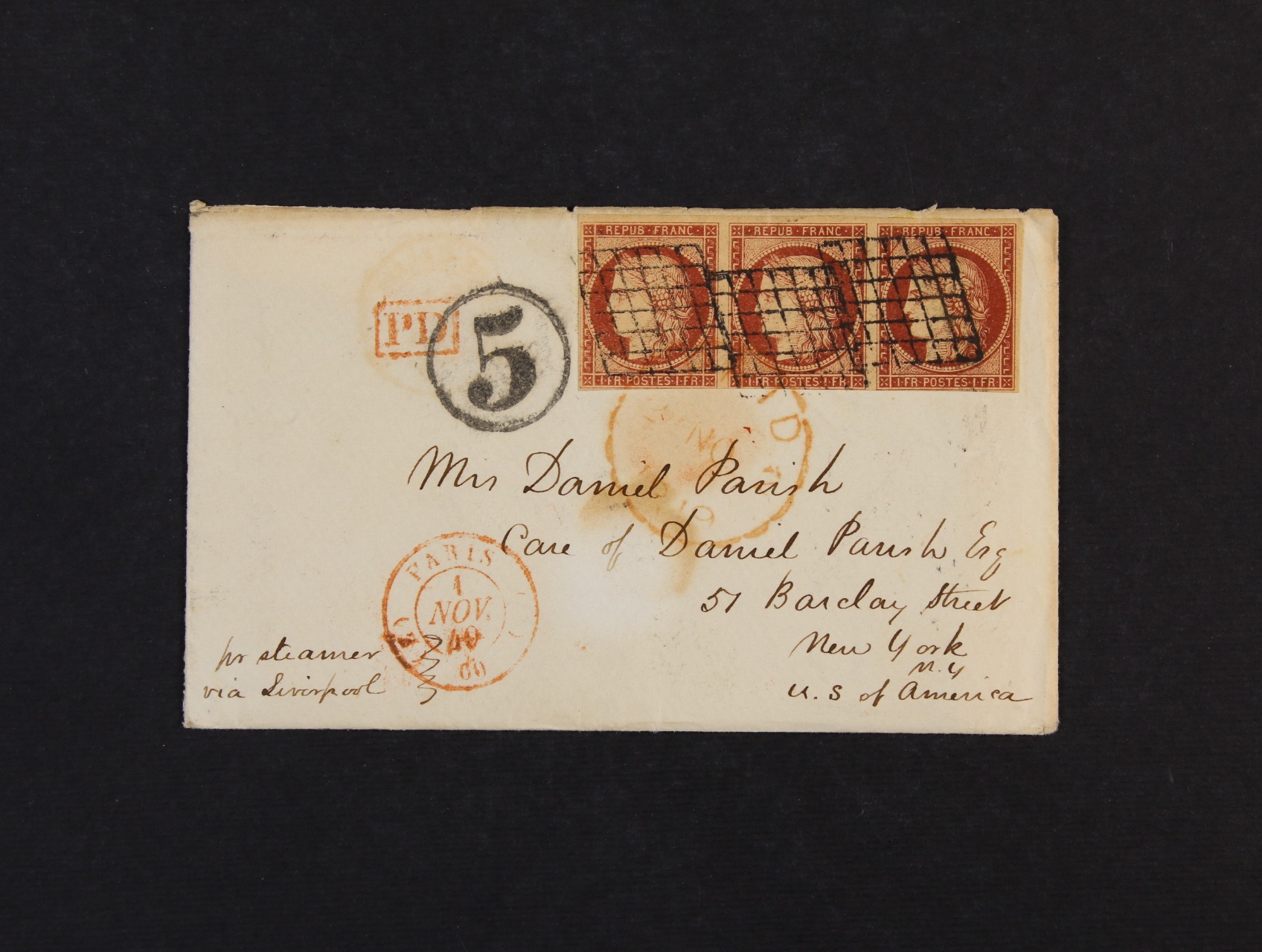 1570 1849 dopis frank. 3-páskou Yvert. 6b, Ceres 1Fr tmavě karmínová, zasláno z Paříže do USA, raz. PARIS 1 NOV 49, tranzitní britské PAID 2.NOV 1849 a PD (Paye Destination), vyznačen US tarif 5C; vzadu chybí horní chlopeň, nicméně krásný malý dopis se vzácnou frankaturou, kat. Yvert 7.000 EUR 21000
