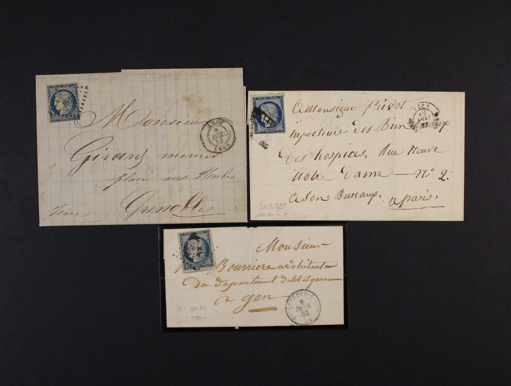 1571 skl. dopis z r. 1851 frank. zn. Mi. č. 4a s pod. čís. kosočtvercovým raz. + hůřečitelné DR, skl. dopis z r. 1852 frank. zn. Mi. č. 4b s číselným kosočtvercovým raz. + DR LYON 6.DEC.52 a skl. dopis z r. 1852 frank. zn. Mi. č. 4b s čís. kosočtvercovým raz. + DR 8.FEV.52, vše průch. a přích. raz., zajímavé 1800