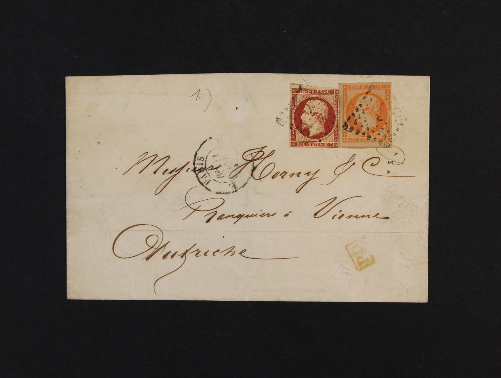 1572 skl. dopis z r. 1856 do Vídně frank. zn. Mi. č. 15b + 16a, pod. čís. kosočtvercové raz. + DR PARIS 11.10.56 + přích. raz. 2600