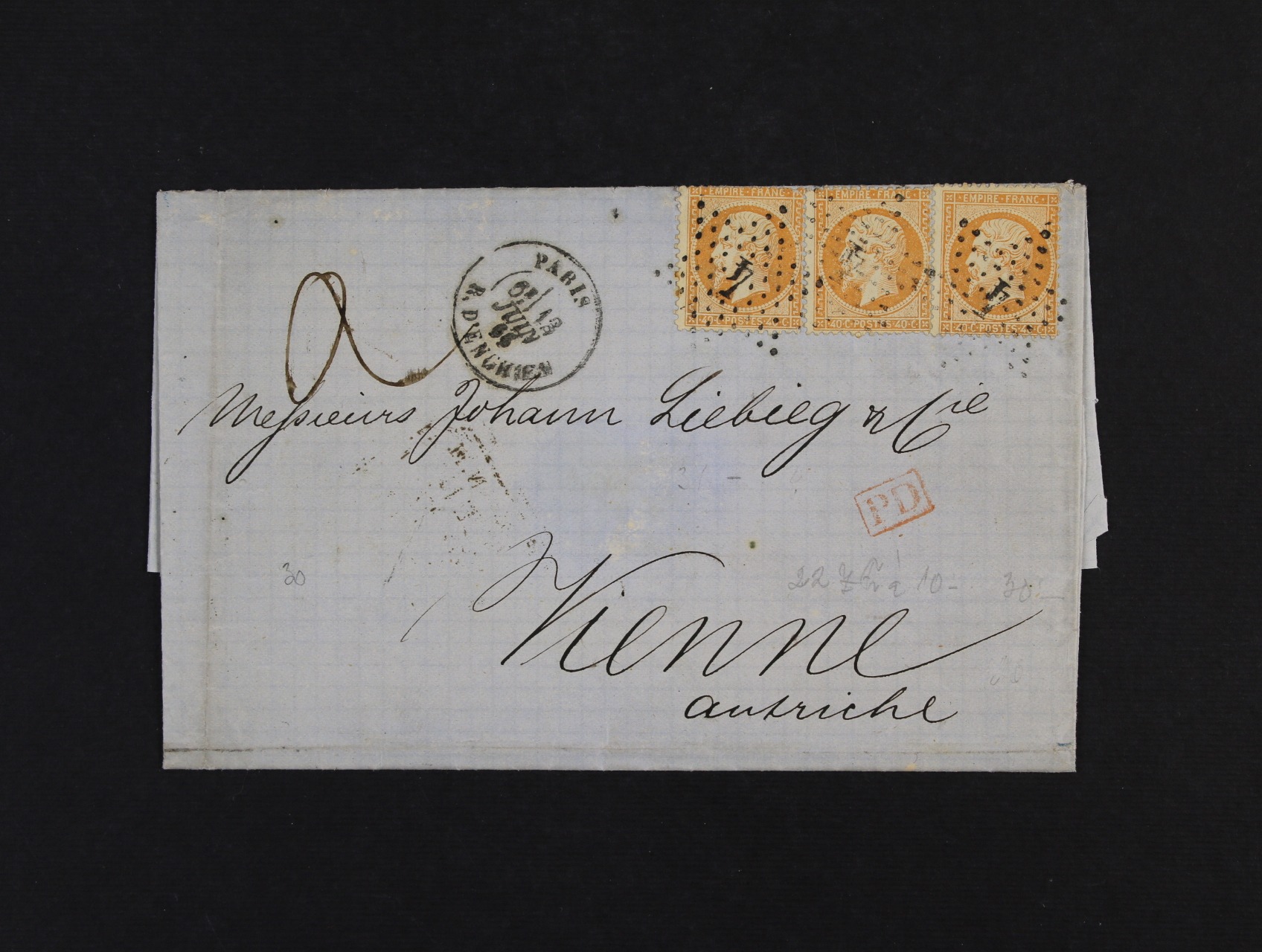 1573 skl. dopis z r. 1866 do Vídně frank. zn. Mi. č. 22 (3x) s pod. čís. hvězdicovým raz. 4, DR PARIS 13.JUN.66 + přích. raz. 500