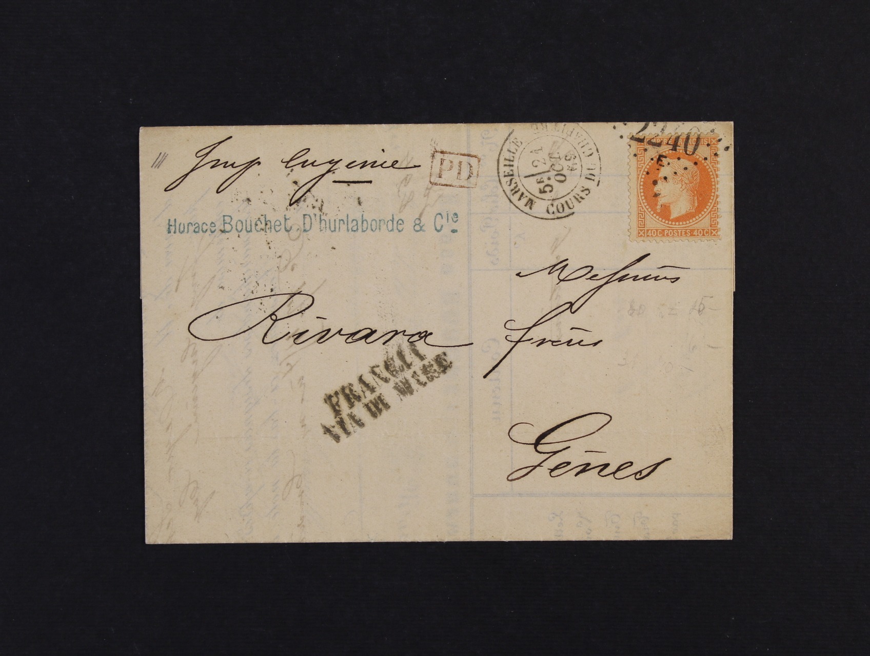1574 skl. dopis z r. 1869 frank. zn. Mi. č. 22a 40ct červeněoranžová, pod. čís. kosočtvercové raz. 2240 + DR MARSEILLE 21.OCT.69 + průch. a přích. raz., zajímavé, velmi dobrá kvalita 600
