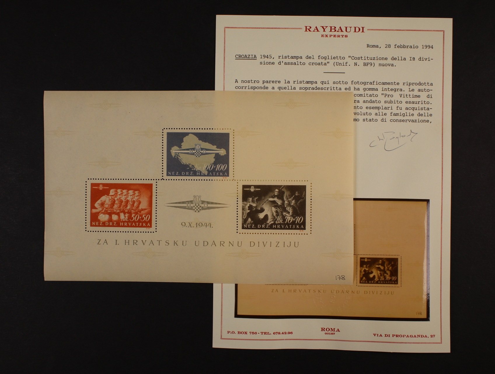 1577 1945 Unifil N.BF9, aršík "Sturmdivision", oficiální vydání chorvatské exilové vlády pro dobročinné účely; vydání komise "Pro Vitime di Guerra", náklad jen 400ks, bezvadné, atest Raybaudi 3000