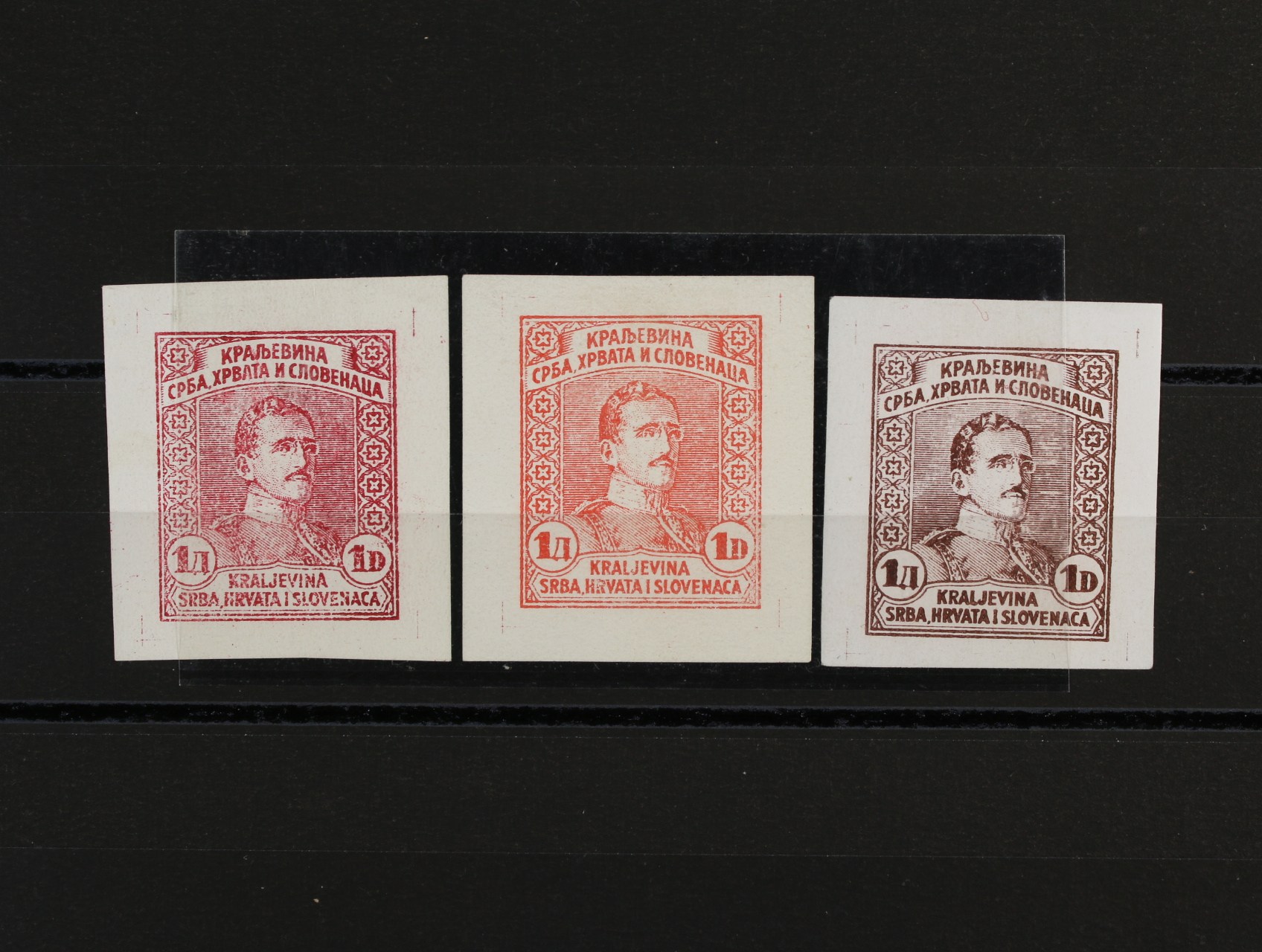 1578 tři nepřijaté návrhy na zn. v hodnotě 1Dinár KRALJEVINA, SRBA., HRVATA I SLOVENCA v barvě fialové, červené a hnědé 300