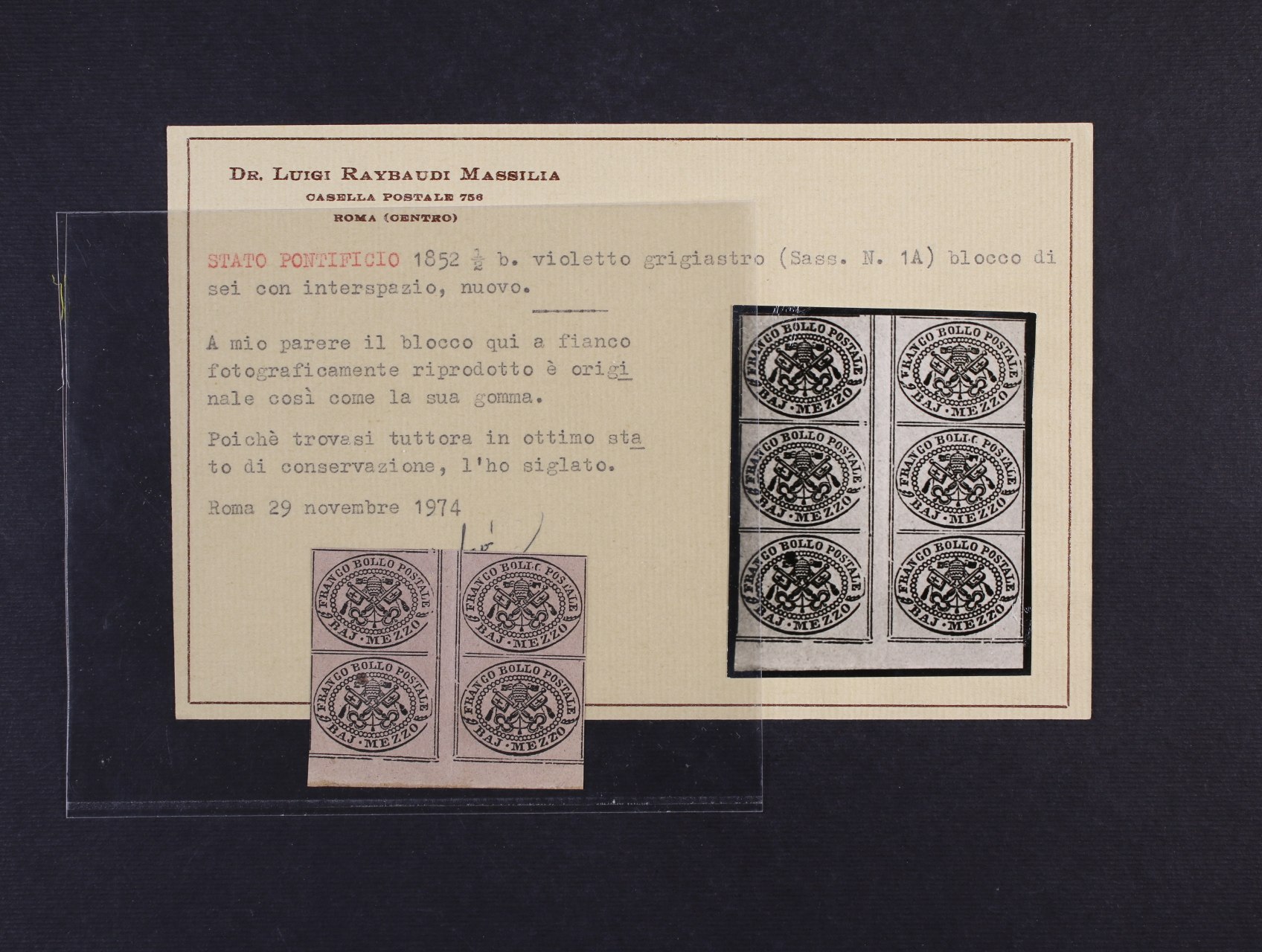1580 Církevní stát - zn. Sas. č. 1 A ve čtyřbloku se svislým meziarším se spodním okrajem, atest Luigi Raybaudi Massilia, na atestu vyobrazen 6ti-blok, ze kterého horní vodorovná dvoupáska byla odstřižena, neznatelná stopa po nál., kat. Sas. 3000 EUR 6000