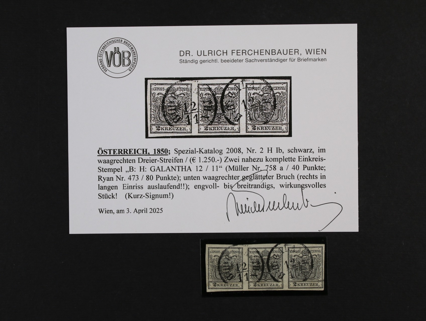 1703 zn. Fe. č. 2 H, typ Ib černá ve vodorovné třípásce - pěkný střih se dvěma kompl. jednokruh. raz. B: H: GALANTHA 12.11., zk. a atest Ferchenbauer, kat. cena 1250 EUR 6000