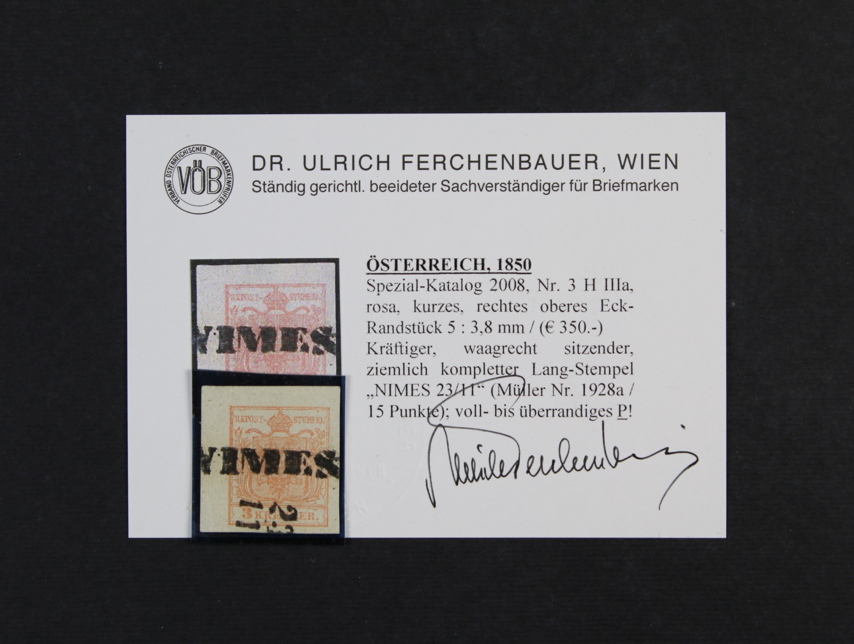 1705 zn. Fe. č. 3 H, typ IIIa, růžová, levý horní kus s okraji 5 : 3,8 mm, téměř kompl. řádk. raz. NIMES 23/11, lux. střih, zk. a atest Ferchenbauer, 350 EUR 1200