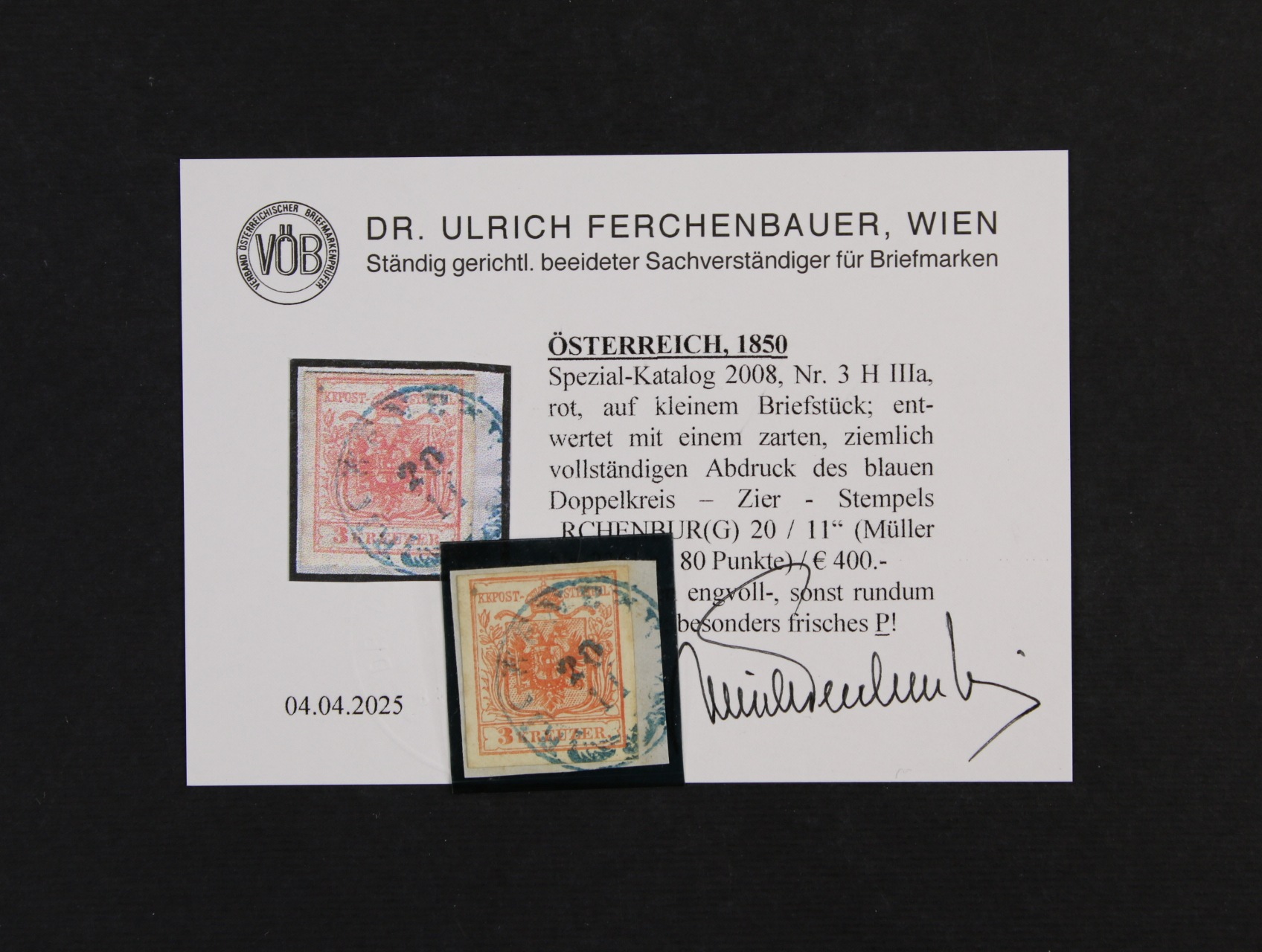 1707 zn. Fe. č. 3 H, typ IIIa na malém výstřižku s téměř kompl. modrým raz. RCHENBURG 20.11., zk. a atest Ferchenbauer, kat. cena 400 EUR 1200