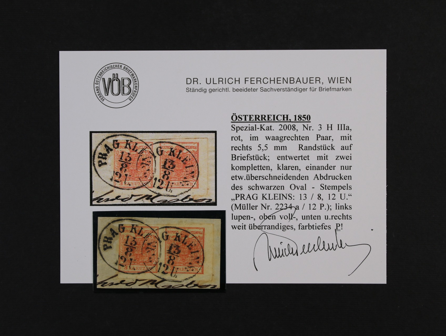 1709 zn. Fe. č. 3 H, typ IIIa červená ve vodorovné dvoupásce s pravým okrajem 5,5 mm na výstřižku se dvěma oválnými raz. PRAG KEINS 13.8., 12 U., zk. a atest Ferchenbauer 500