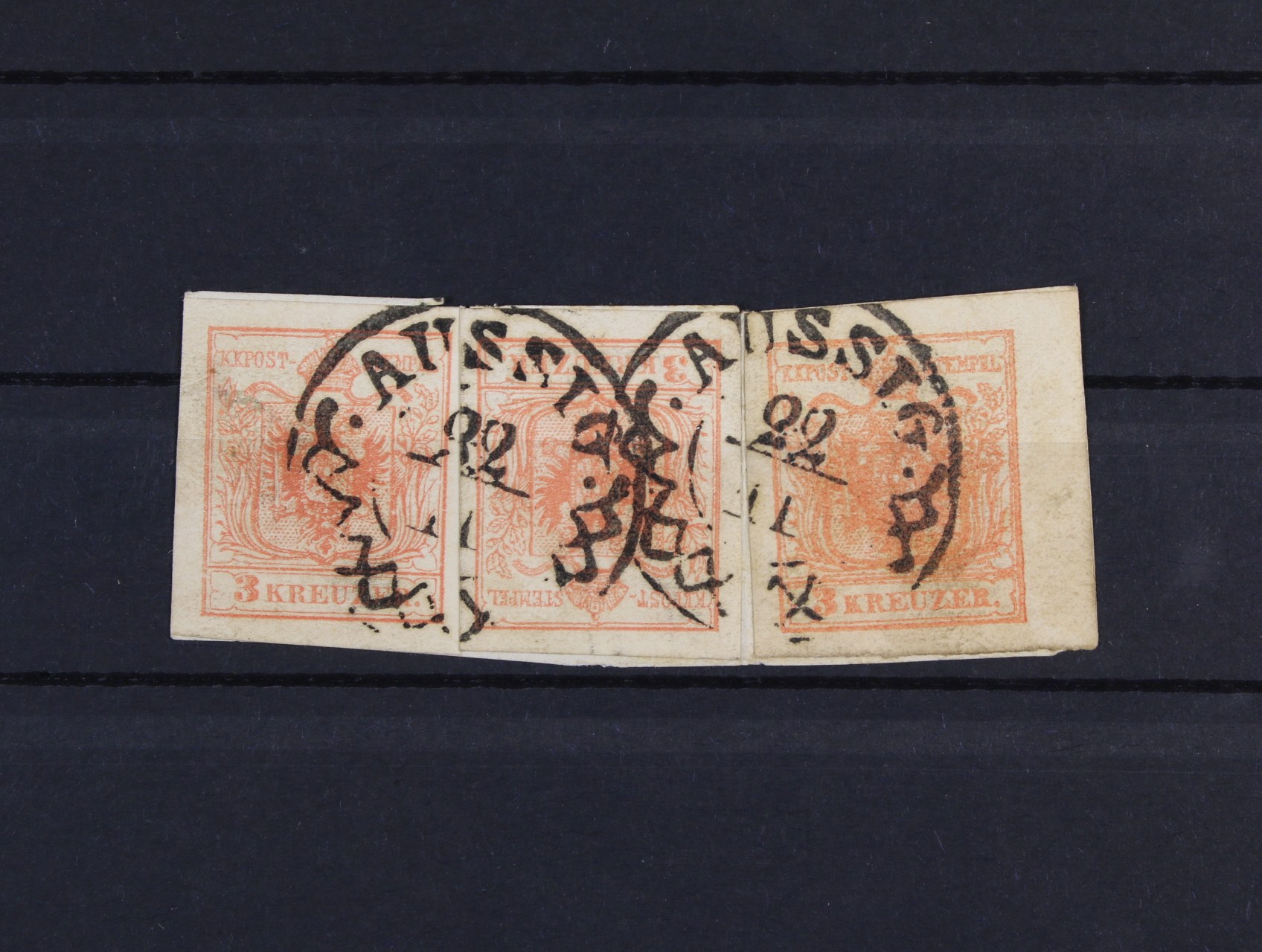 1710 zn. Fe. č. 3 HP, typ III, 3 ks na malém výstřižku se dvěma kompl. raz. AUSSIG 22.11., pravá zn. s okrajem 5 mm 400