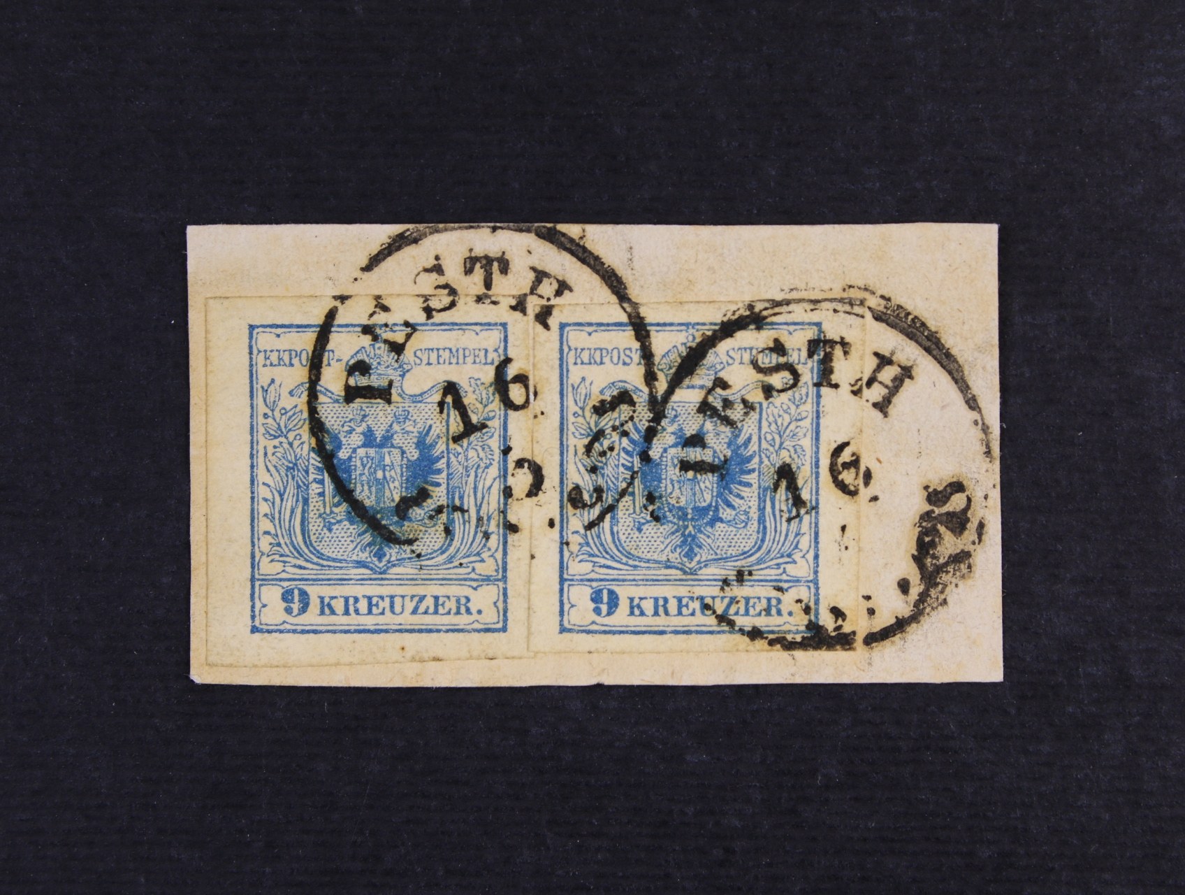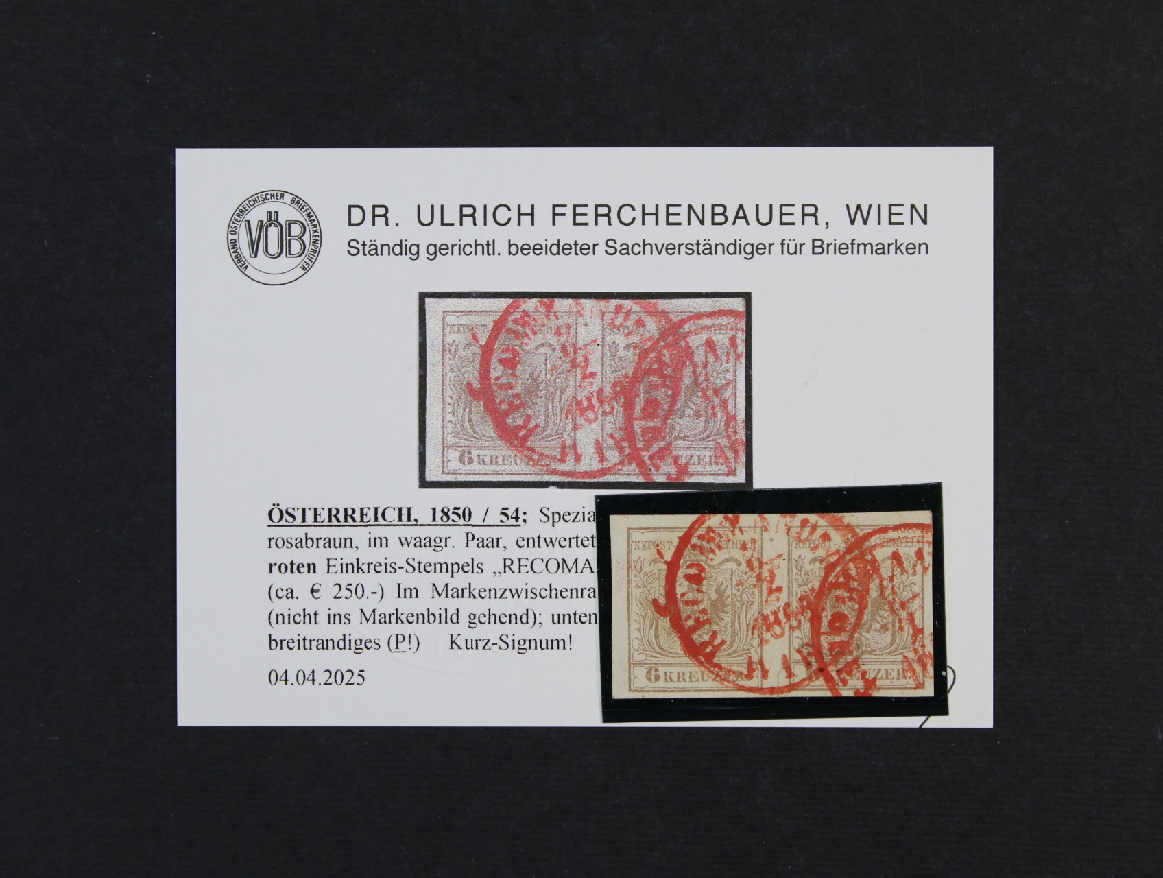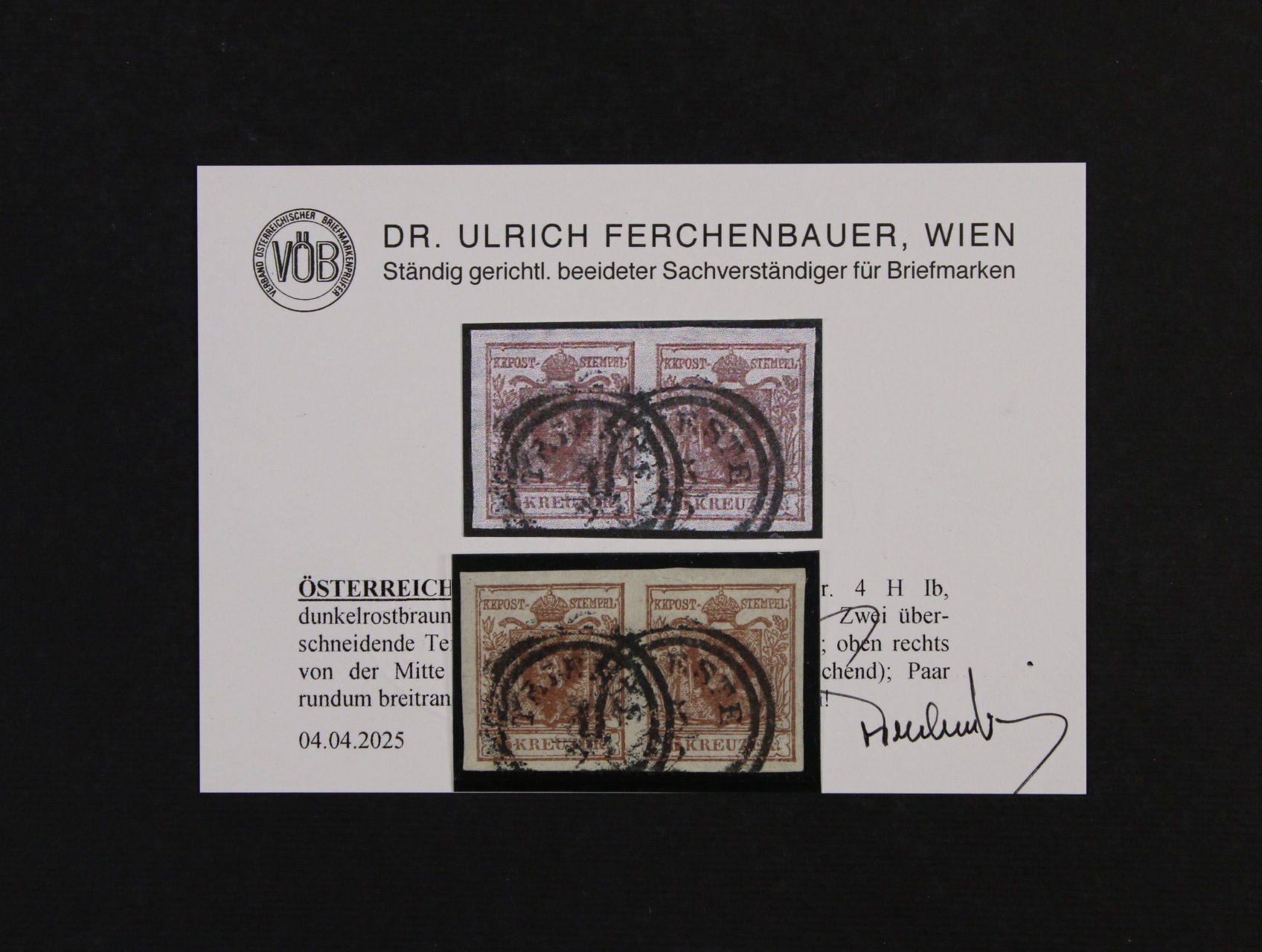 1715 zn. Fe. č. 4 M, typ III, růžověhnědá ve vodorovné dvoupásce se dvěma nekompl. raz. RECOMANDIRT WIEN 8.2.1858, zk. a atest Ferchenbauer, 250 EUR 900