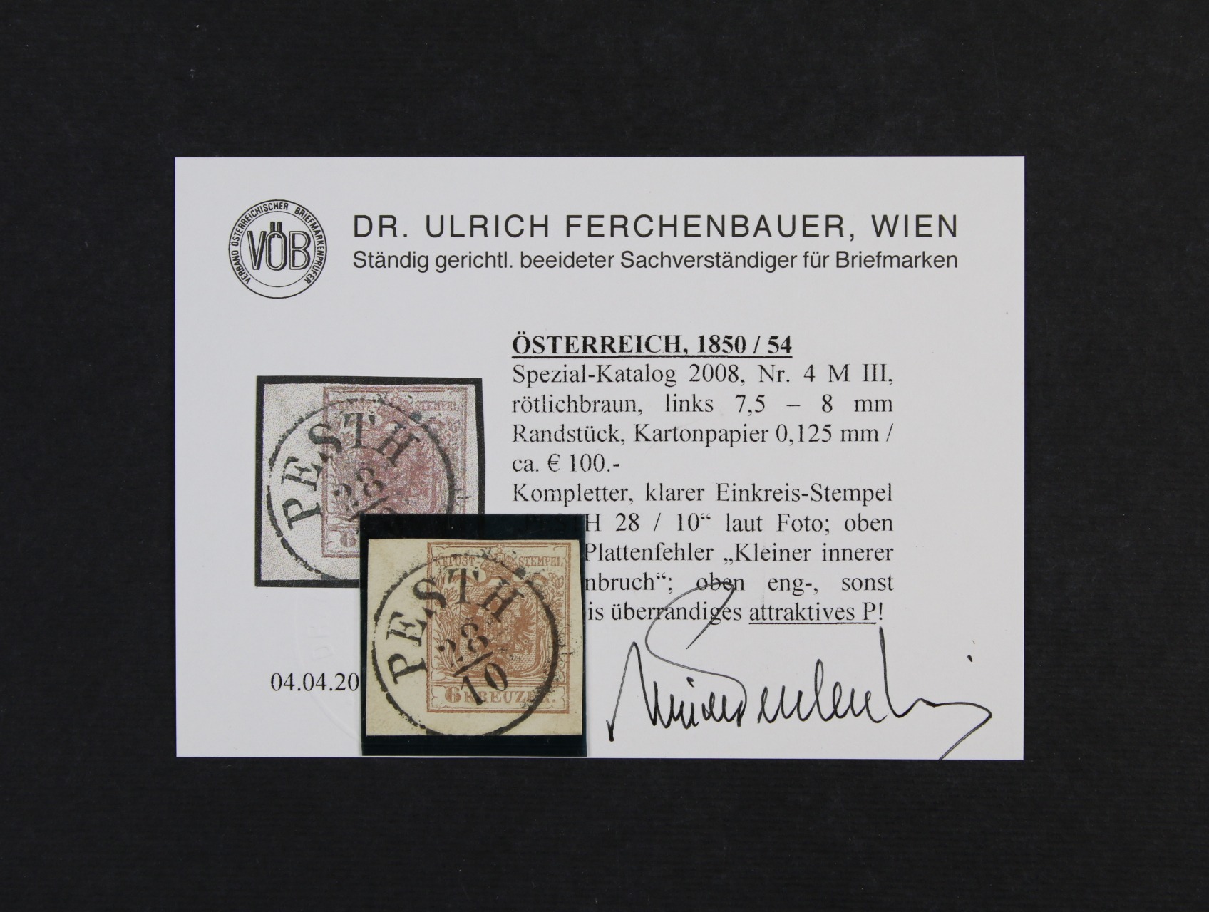 1714 zn. Fe. č. 4 M, typ III červenohnědá s levým okrajem 7,5 - 8 mm, karton. papír 0,125 mm, jednokruh. raz. PESTH 28.10., zk. a atest Ferchenbauer, 100 EUR 400