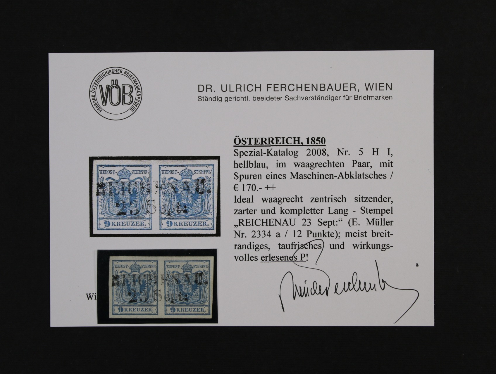 1716 zn. Fe. č. 5 H, typ I světlemodrá ve vodorovné dvoupásce s černým řádk. raz. REICHENAU 23.SEPT., zk. a atest Ferchenbauer, kat. cena 170 EUR ++ 900