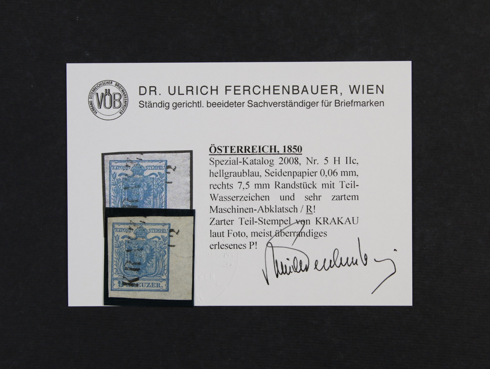 1717 zn. Fe. č. 5 H, typ IIc, světlešedomodrá na slabém papíře 0,06 mm, s pravým okrajem 7,5 mm a částí průsvitky, na zadní str. stroj. obtisk, znehodnoc. řádk. raz. von KRAKAU, zk. a atest Ferchenbauer s označením R 1500