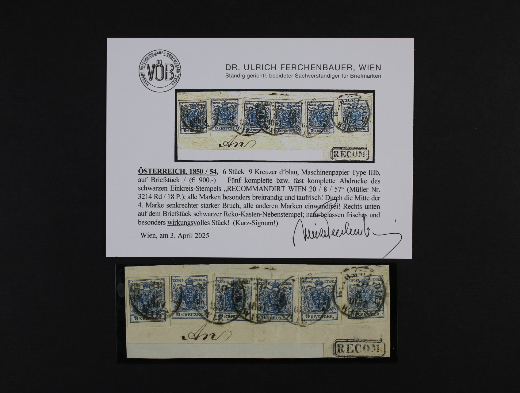 1719 zn. Fe. č. 5 M, typ IIIb změvě modrá, 6 ks na výstřižku s jednokruh. raz. RECOMMANDIRT WIEN 20.8.1857 + rámeč. černé raz. RECOM, na čtvrté zn. zleva lom, zk. a atest Ferchenbauer, kat. cena 900 EUR 4000