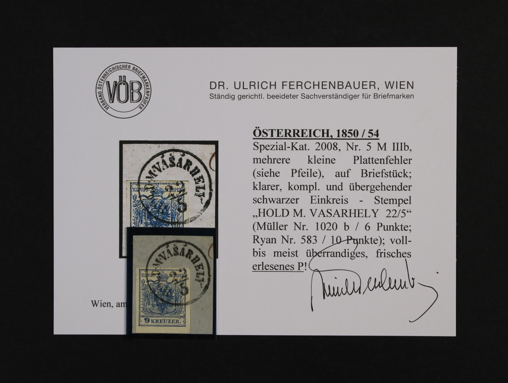 1720 zn. Fe. č. 5 M, typ IIIb s DV několik bílých skvrn v obrazu zn. na výstřižku s kompl. jednokruh. raz. HOLD EM. VASARHELY 22.5., zk. a atst Ferchenbauer 500