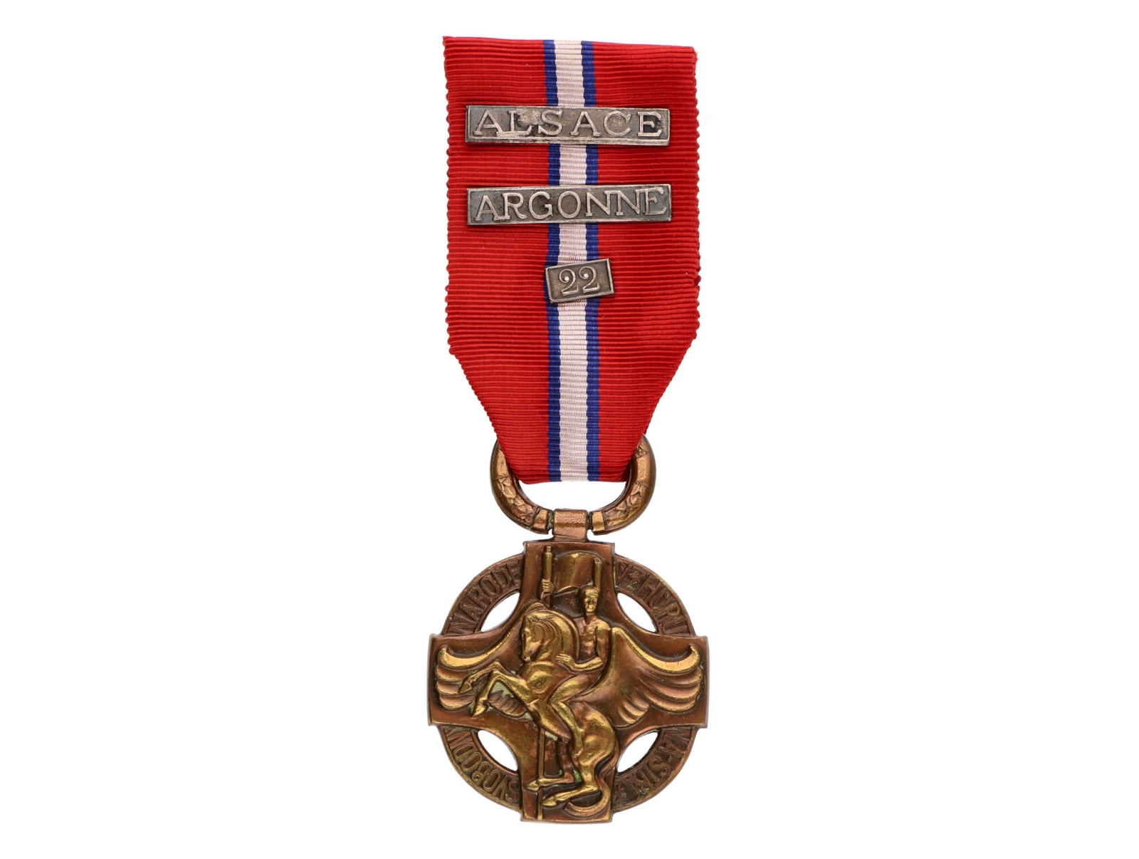 Československá revoluční medaile, lehká varianta bez podpisu medailéra, tmavší bronz, se štítkem ALSACE, ARGONE a 22 na stuze, VM6
