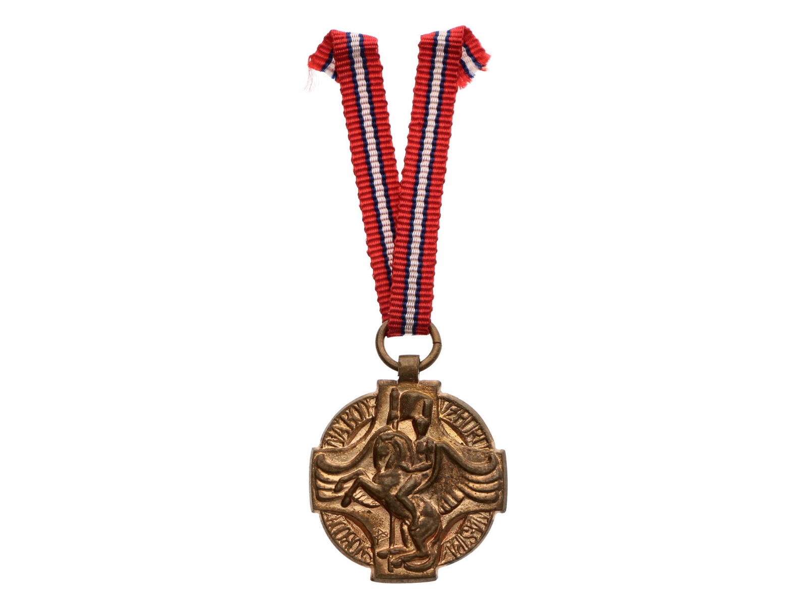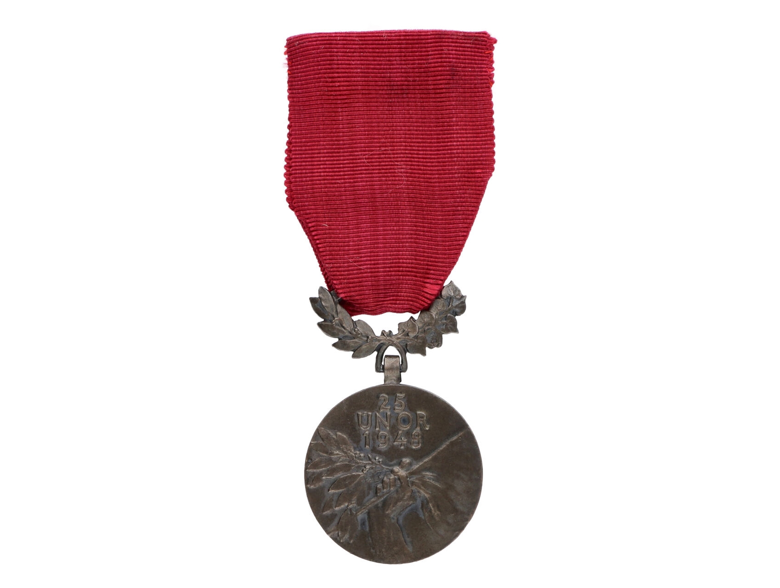 Československá revoluční medaile, lehká (dutá) varianta s podpisem medailéra, varianta s tenším závěsem, se štítkem DOSSALTO a 32, VM6
