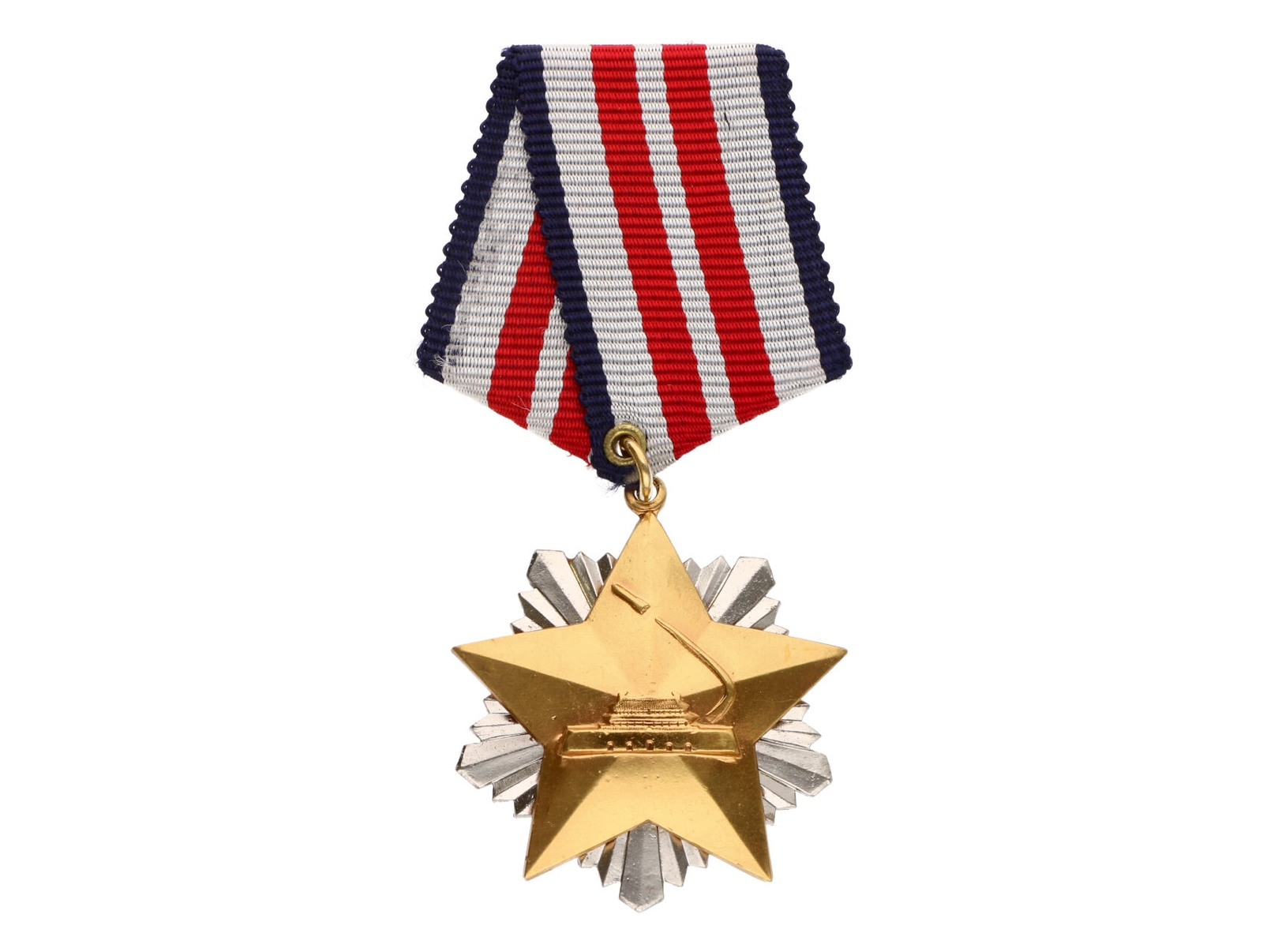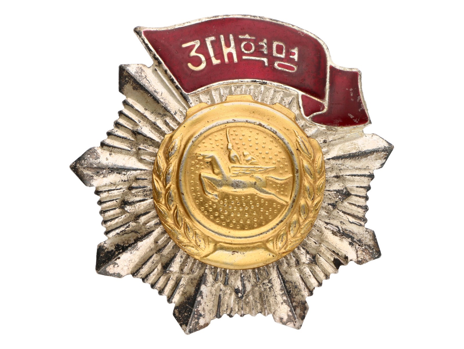 446 Severní Korea - Řád rudého praporu tří velkých revolucí, postříbřený a pozlacený bronz, smalt, průměr 60 mm, upínání na svislou jehlu 500