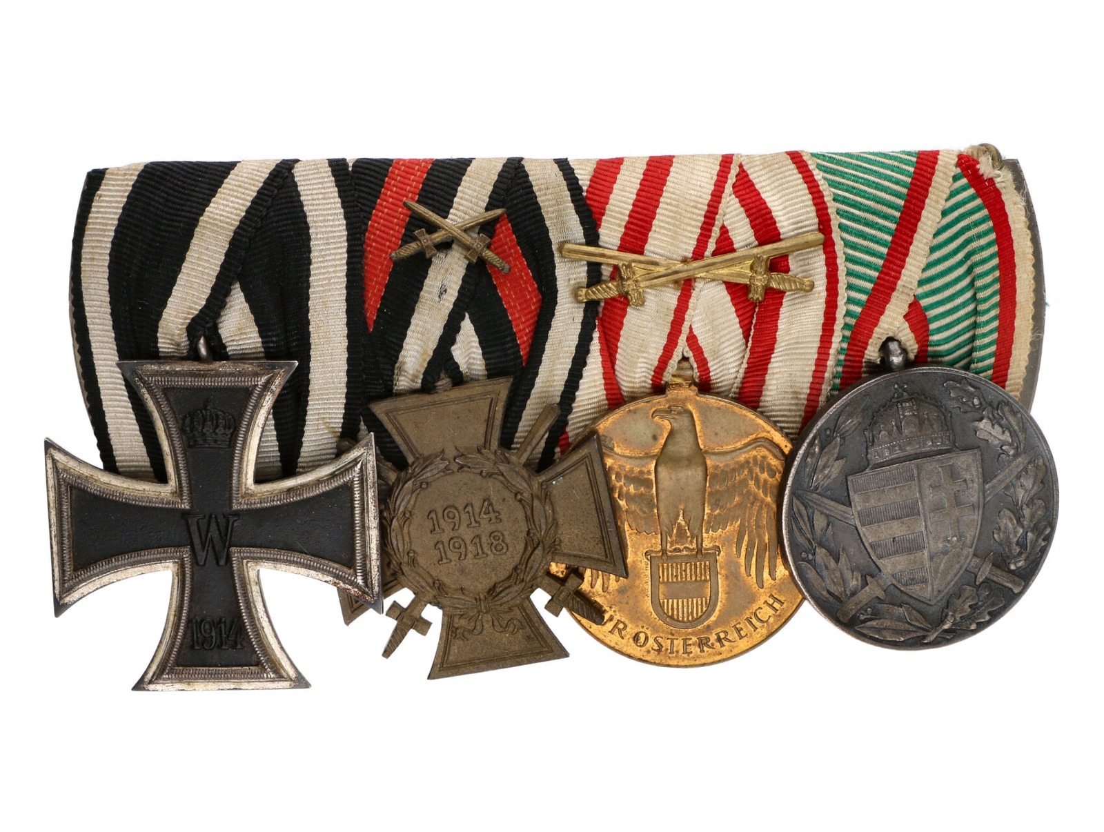 449 Spojka vyznamenání, Železný kříž II.tř., Čestný kříž 1914-1918 pro frontové bojovníky, rakouská pamětní medaile na první sv. válku a maďarská pamětní medaile na I. sv. válku pro bojovníky 2000