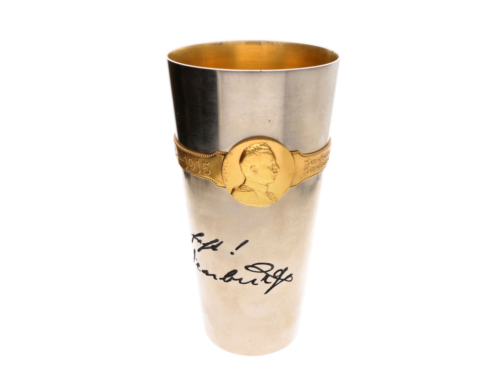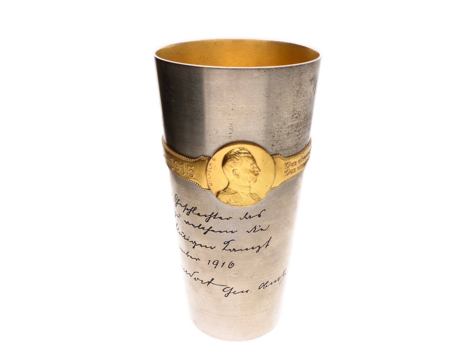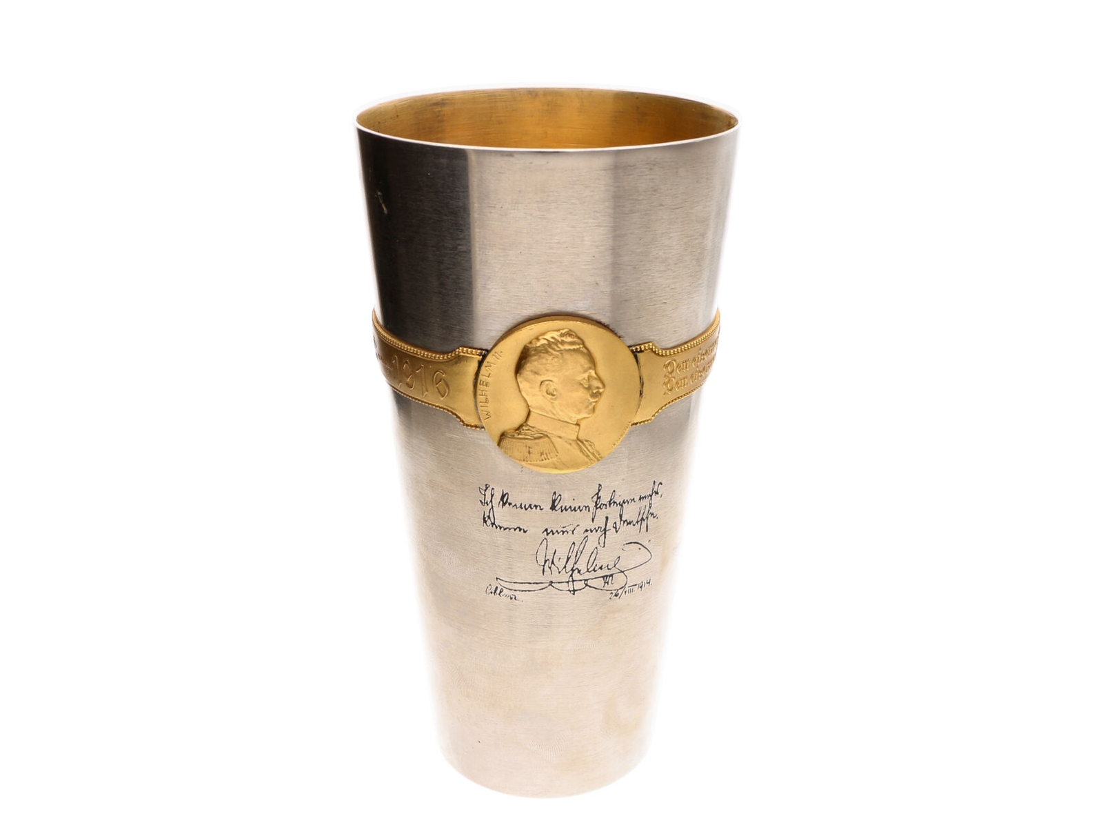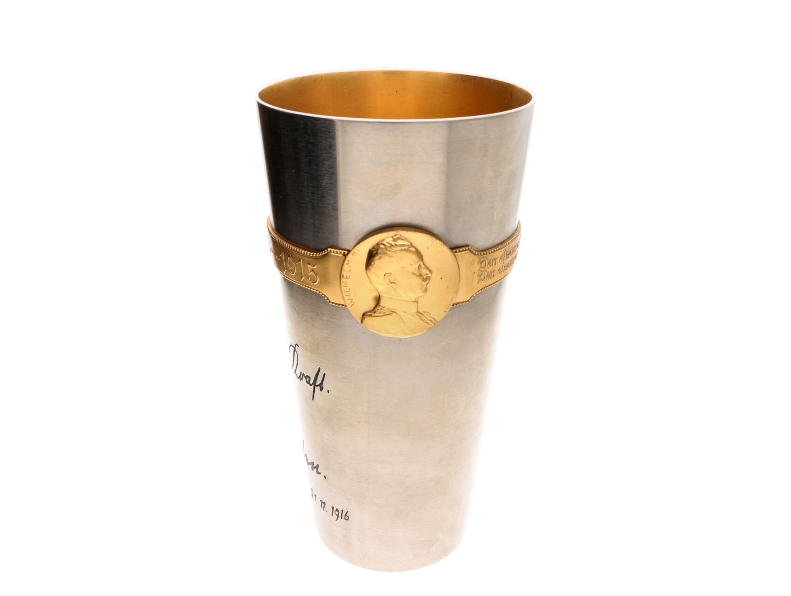 452 Rakousko-uhersko - Pamětní válečný pohár FRANZ JOSEPH I. WILHEM II., opis Kriegs Becher 1914 - 1916, Den eisernen Becher den vollen weiht den eisernen helden der eisernen Zeit! s vyleptanými texty s podpisy F.J.I. a Viléma. Železo 147x75 mm, na spodní straně značka výrobce KRUPP BERNDORF (běžící medved) 1200