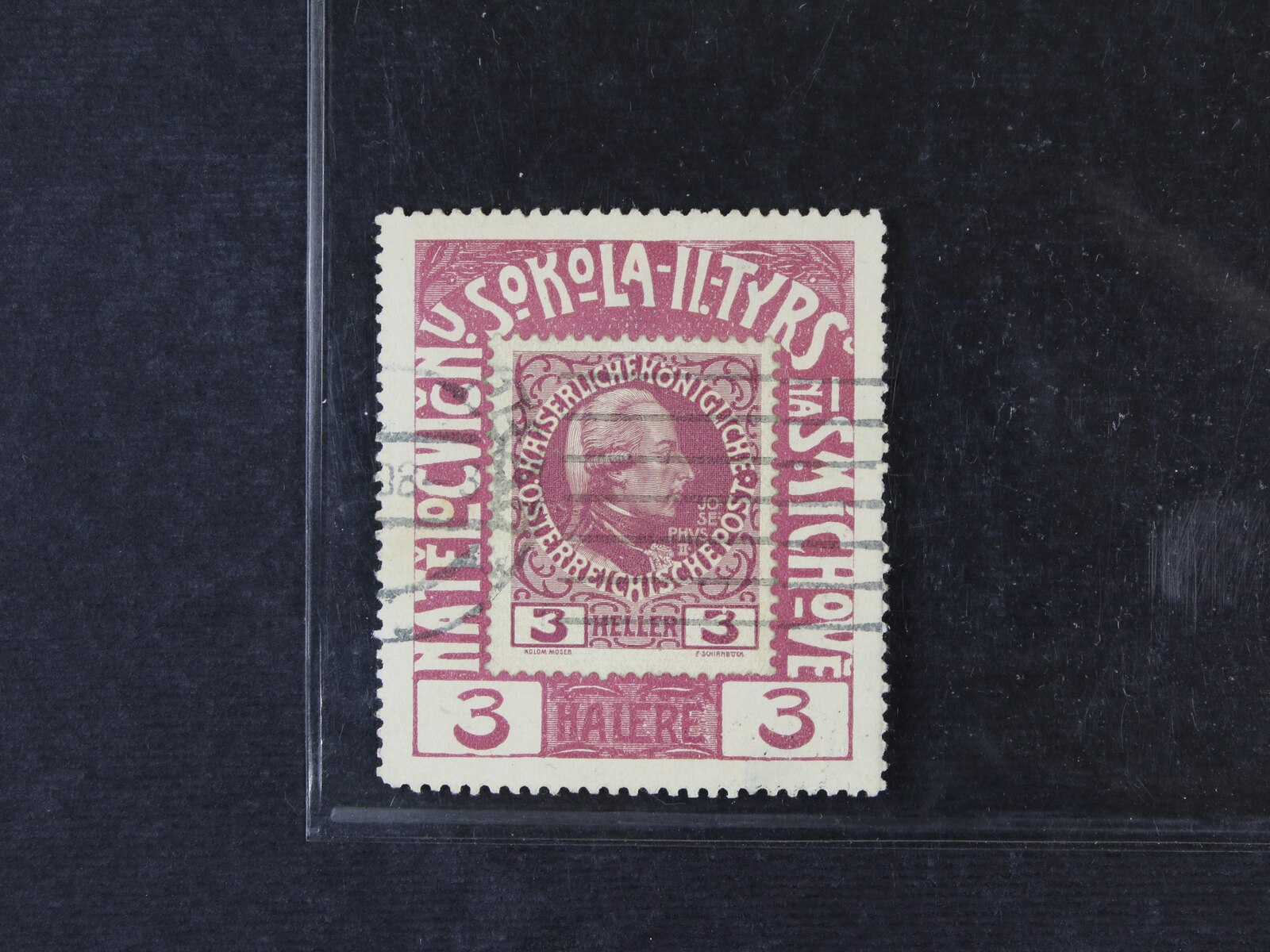 Praha, 3 h 1908 Na tělocvičnu sokola II.Tyrš na Smíchově s nalepenou poštovní známkou 3 h s raz. Jubilejní výstavy v Praze 7.9.1908, zoubkovaná