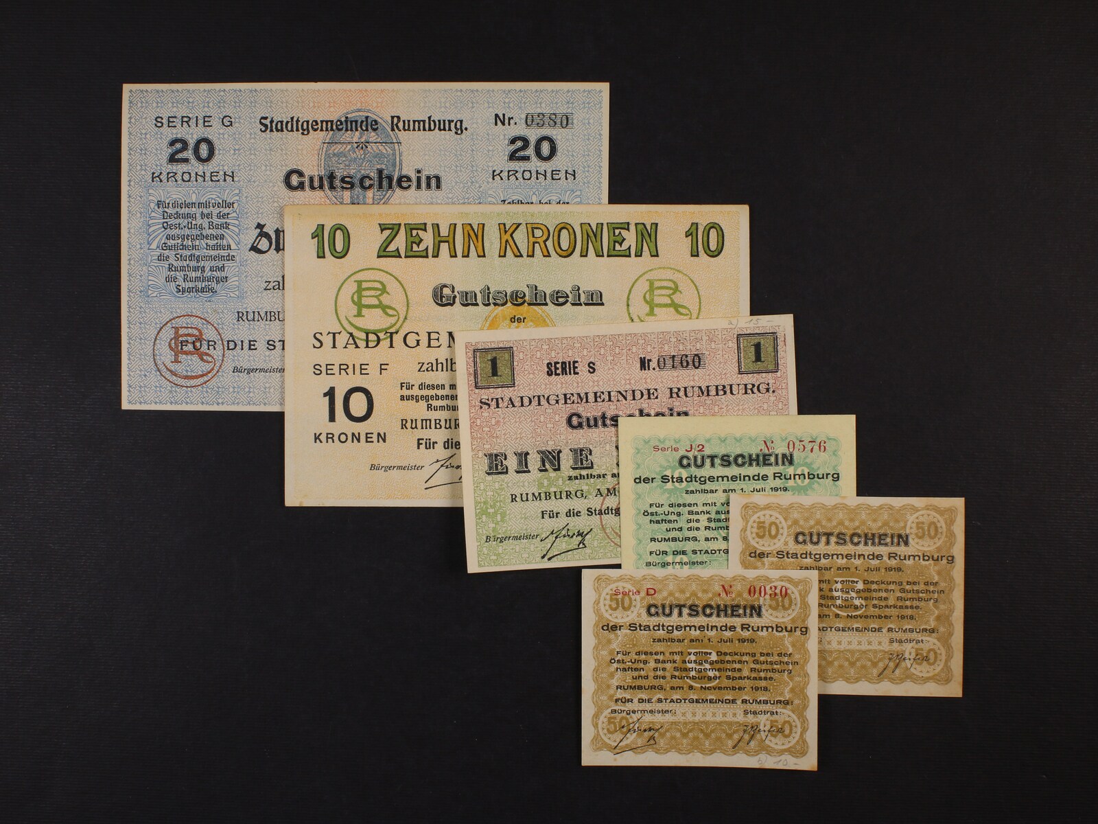 Rumburg (Rumburk) 10, 50 h, 1, 10, 20 K 8.11.1918 město, H.H. 192.3.1a, 2b, 3b, 4a, 5a, 5b, celkem 6 kusů