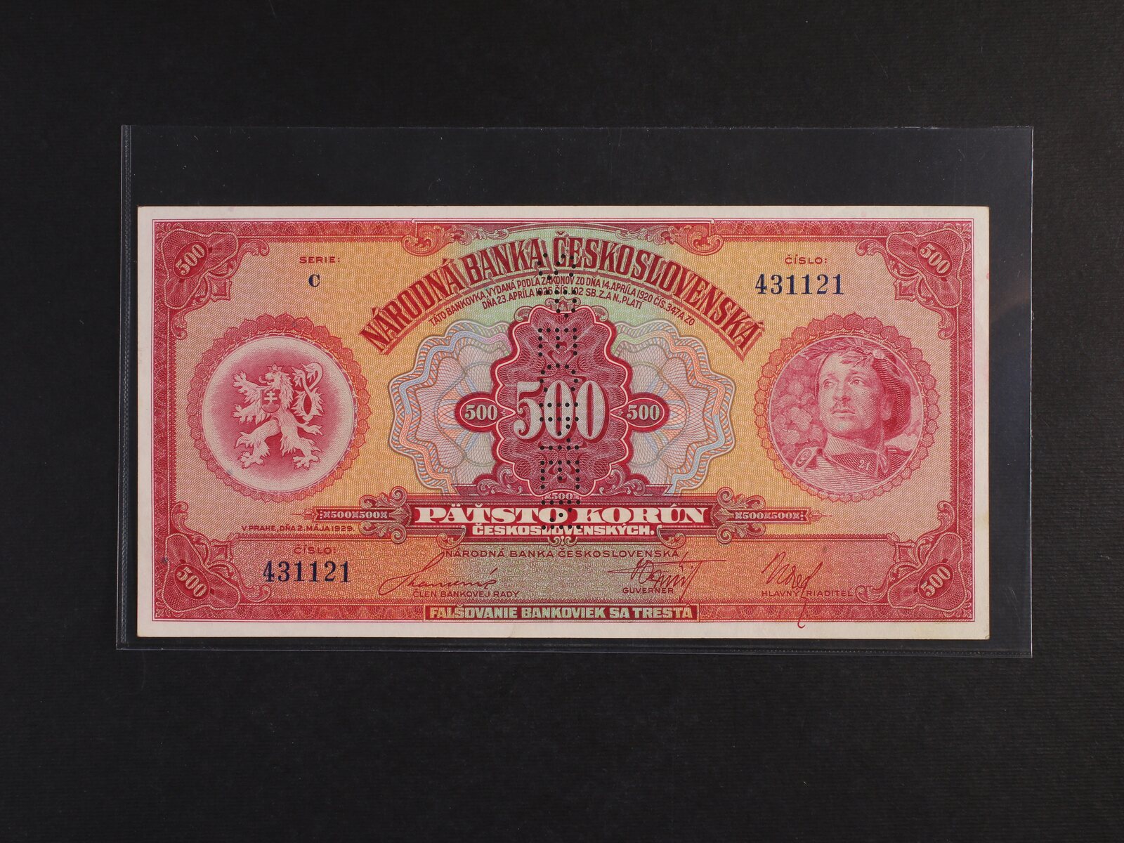 566 500 Kč 2.5.1929 série C bankovní vzor se svislou perforací SPECIMEN uprostřed, Ba. 23c, Pi. 24s, He. 23V5b 15000