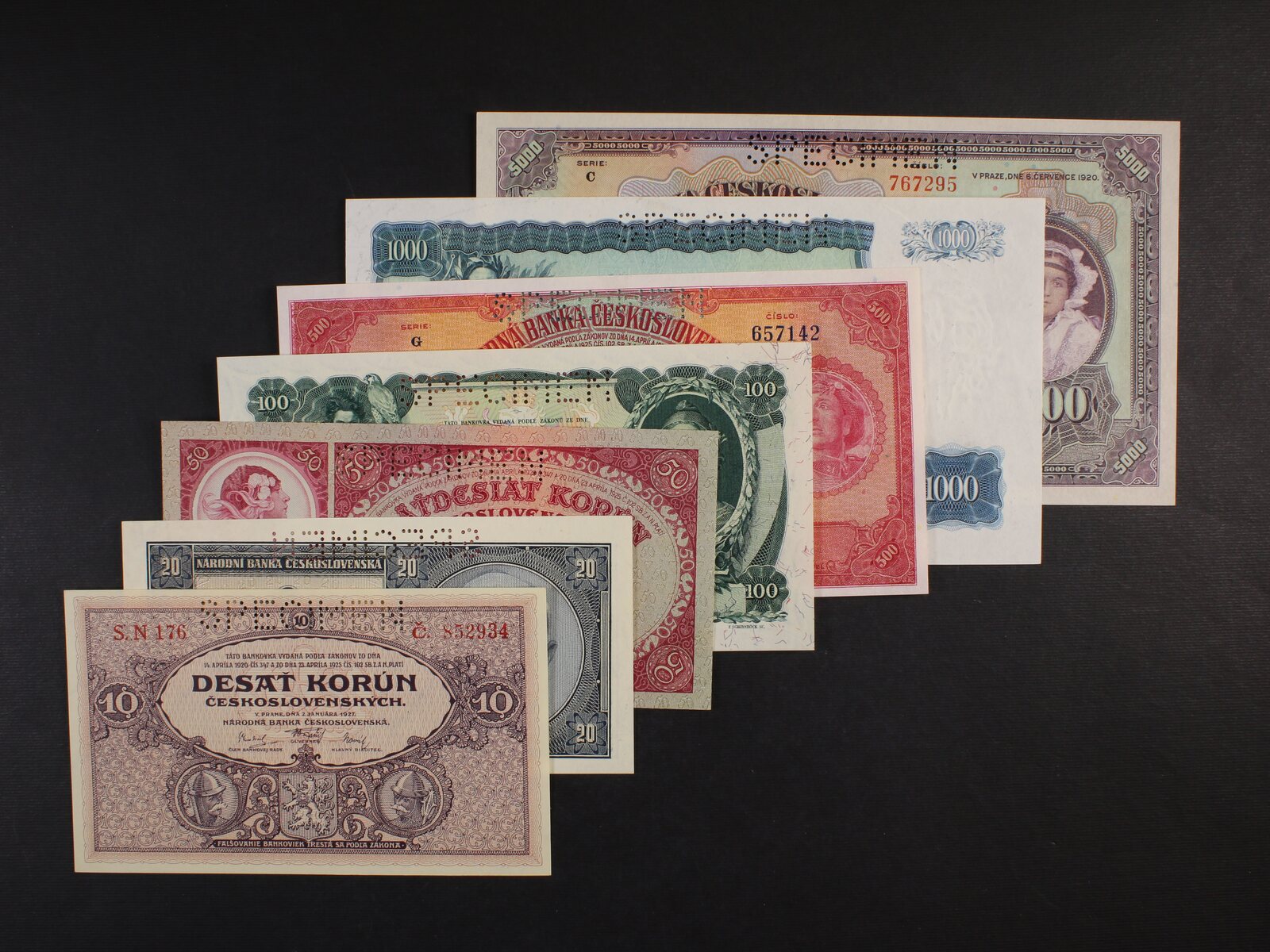 sada bankovek s perforací SPECIMEN - 10 Kč 1927 N 176, 20 Kč 1926 Sg, 50 Kč 1929 Vb, 100 Kč 1931 Zb, 500 Kč 1929 G, 1000 Kč 1934 O, 5000 Kč 1920 C, celkem 7 kusů