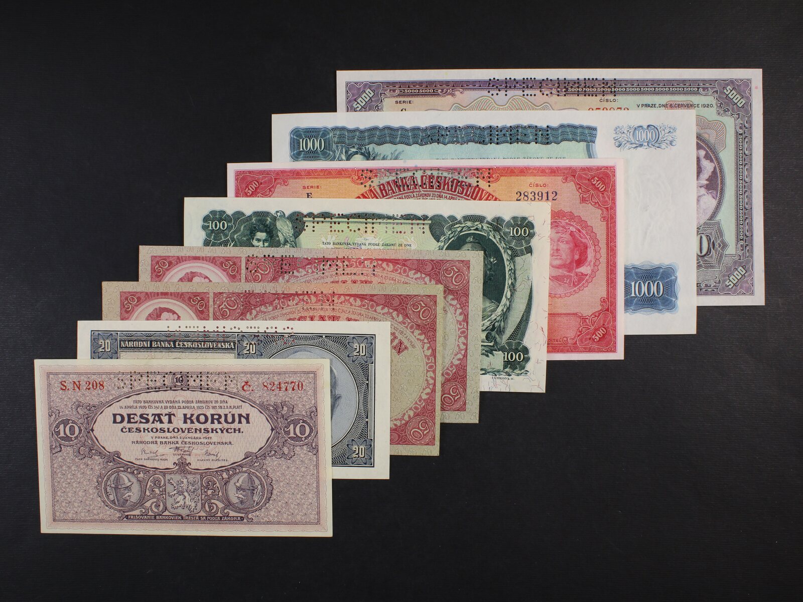 sada bankovek s perforací SPECIMEN - 10 Kč 1927 N 208, 20 Kč 1926 Mf, 50 Kč 1929 Fb, Ib, 100 Kč 1931 Zb, 500 Kč 1929 E, 1000 Kč 1934 L, 5000 Kč 1920 C, celkem 8 kusů