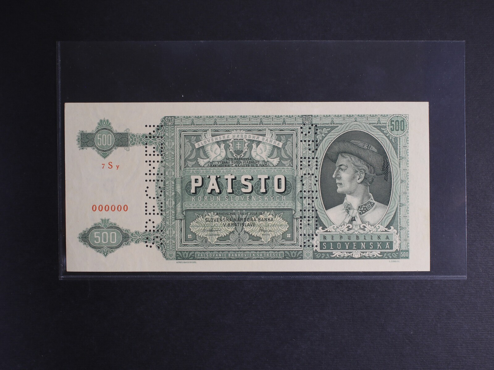 500 Ks 12.7.1941 série 7Sy anulát, bankovní vzor s 2x svisle perforací SPECIMEN, Ba. 52, Pi. 12s, He. 52 V1