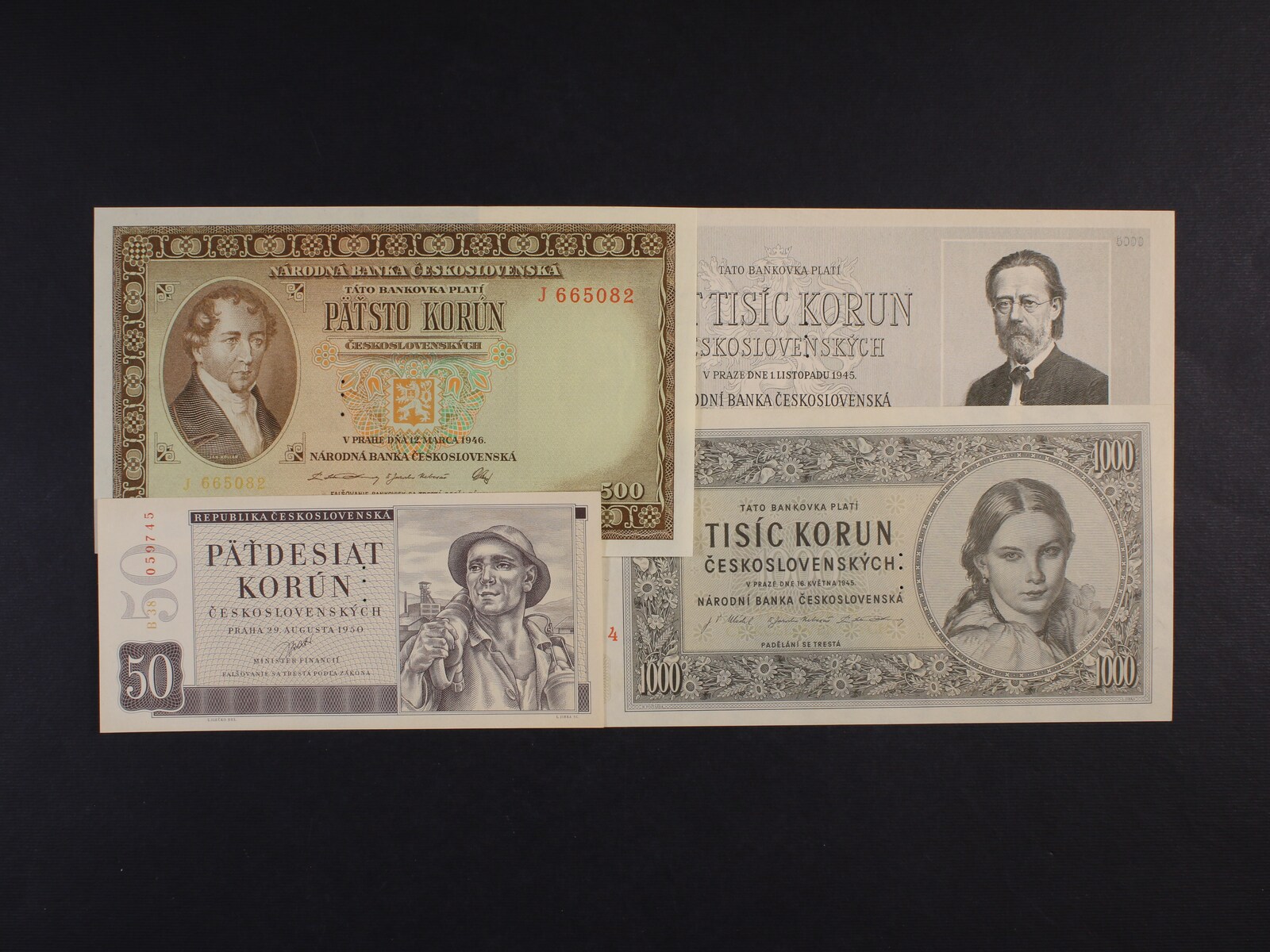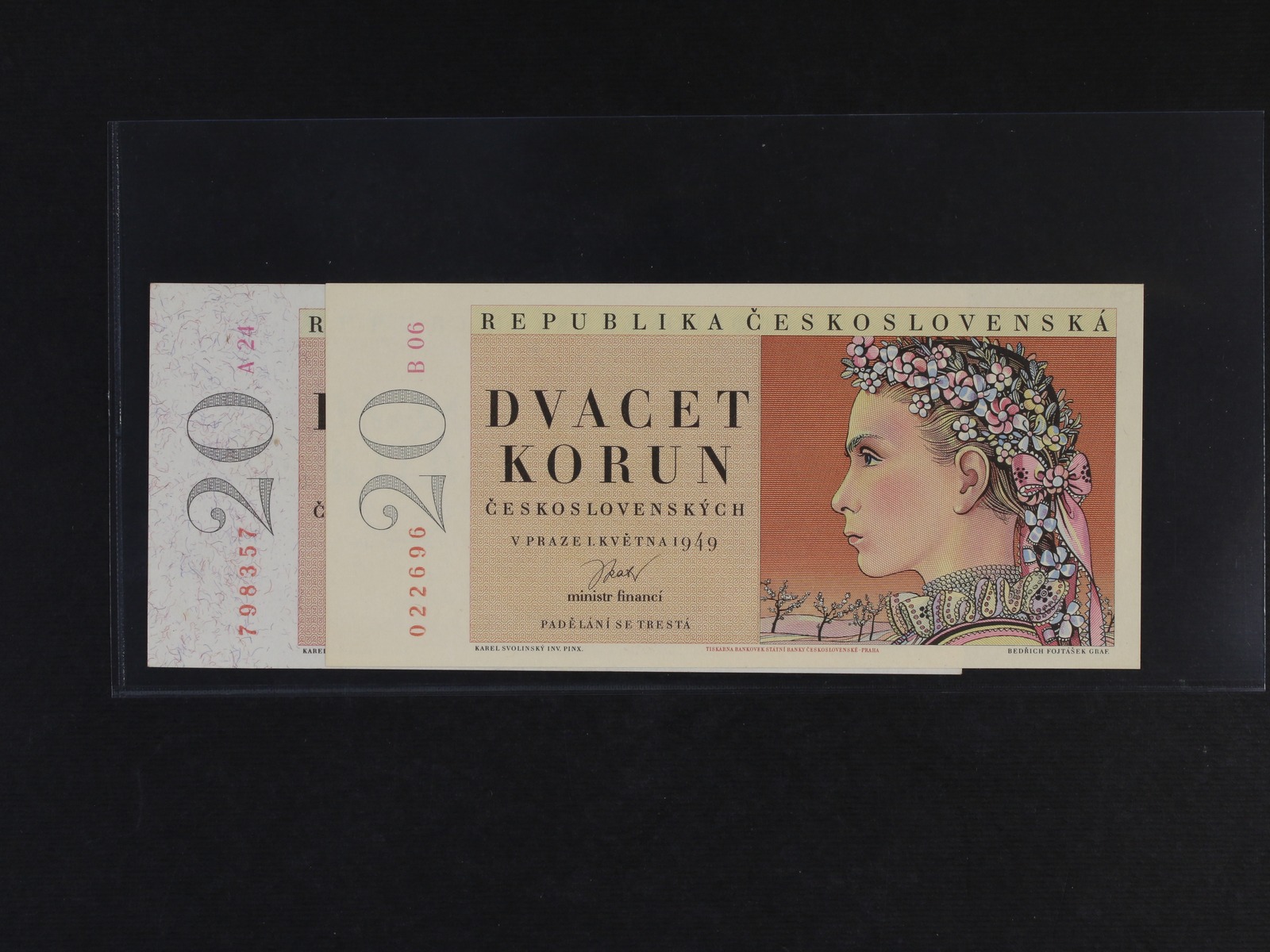 20 Kčs 1.5.1949 série A 17, B 34, 50 Kčs 29.8.1950 série A 07, B 37, Ba. 83a, b, 85a, b, Pi. 70a, 71a, b, 4 kusy