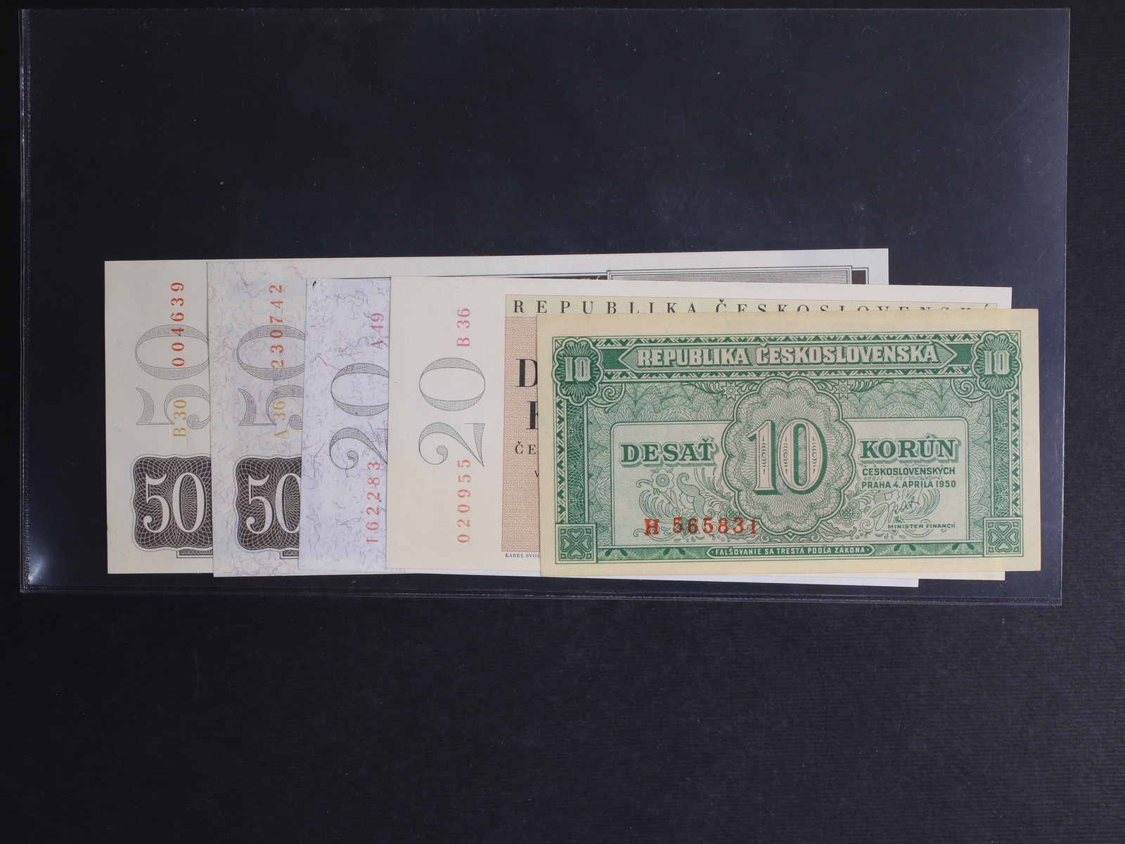 10 Kčs 4.4.1950 série H, 20 Kčs 1.5.1949 série A 49, B 36, 50 Kčs 29.8.1950 série A 36, B 30, Ba. 83a, b, 84a, 85a, b, 5 ks