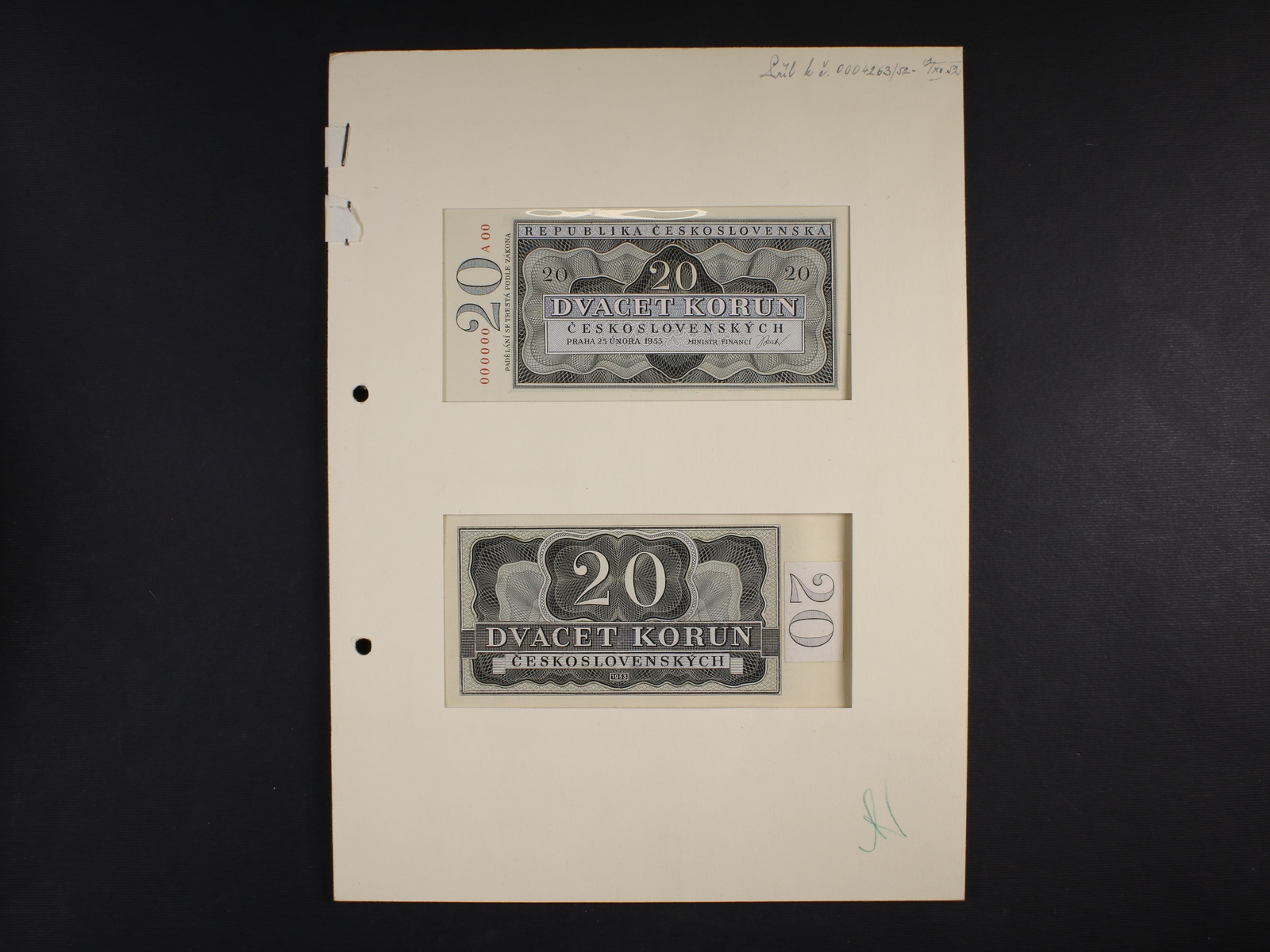 20 Kčs 25.2.1953 série A 00 anulát, původní varianta návrhu, tištěna v pozměněné stavu, nevydaná, koláž, unikát, včetně původního tajného dopisu SBČ na ministersto financí, mimořádná nabídku