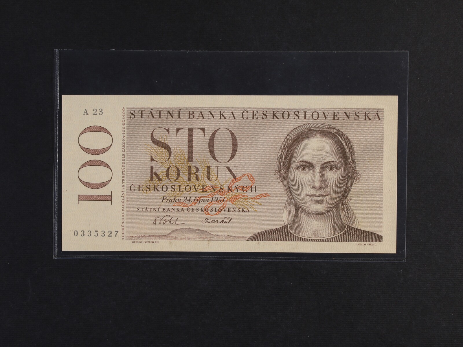 100 Kčs 24.10.1951 série A 23 nevydaná, původní exemplář s modročerným číslovačem Ba. N10, Pi. 76