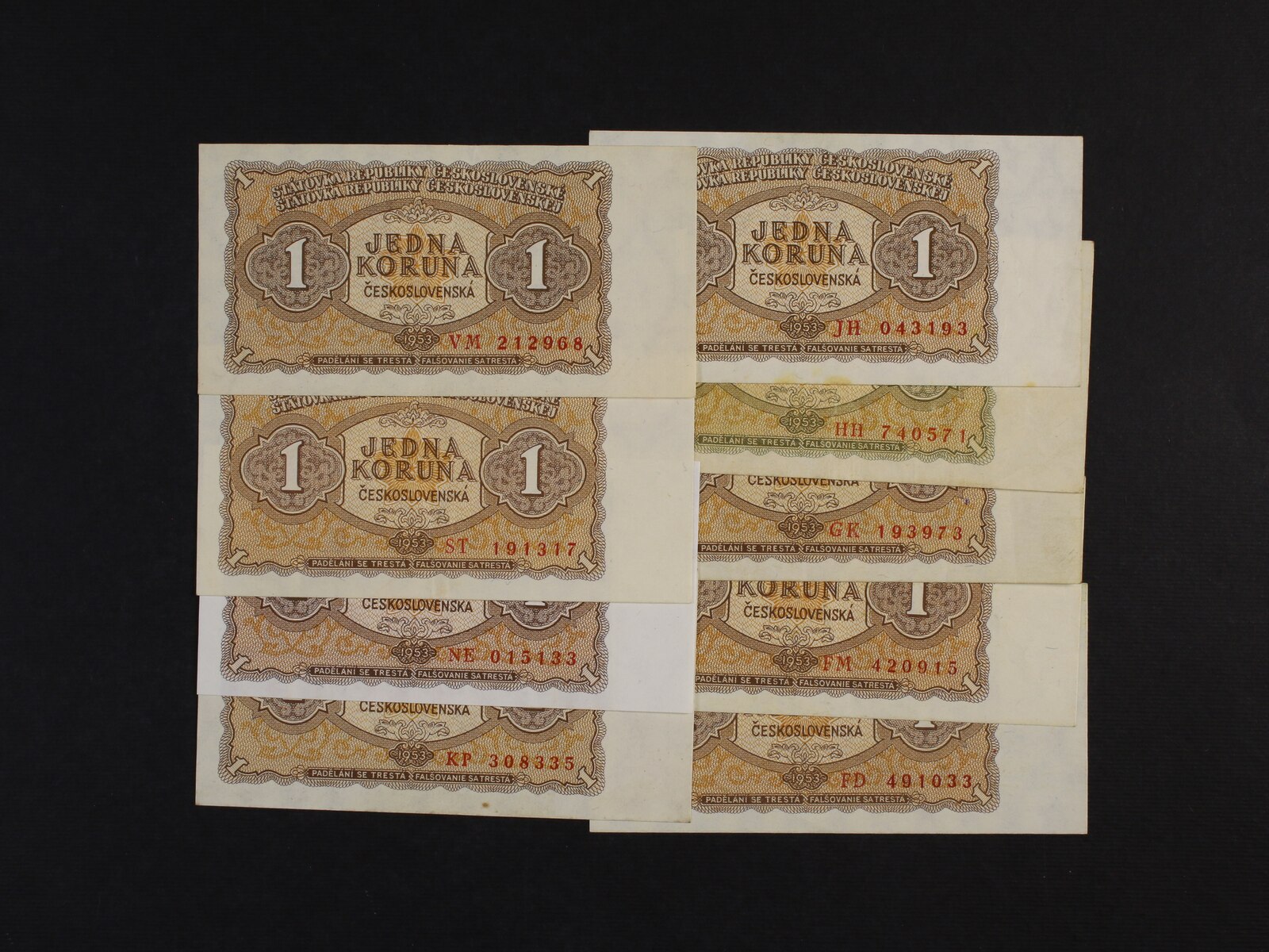 1 Kčs 1953 STC Praha série FD, FM, GK, HH, JH, KP, NE, ST, VM, Ba. 86b, Pi. 78, 9 kusů