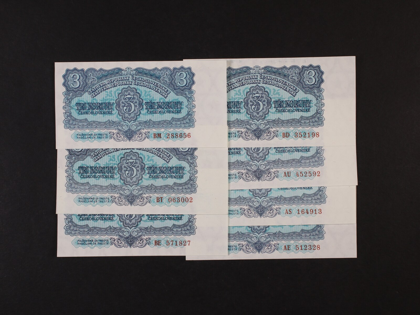 3 Kčs 1953 Goznak Moskva série AE, AS, AU, BD, BE, BM, BT, Ba. 87a, Pi. 79, 7 kusů