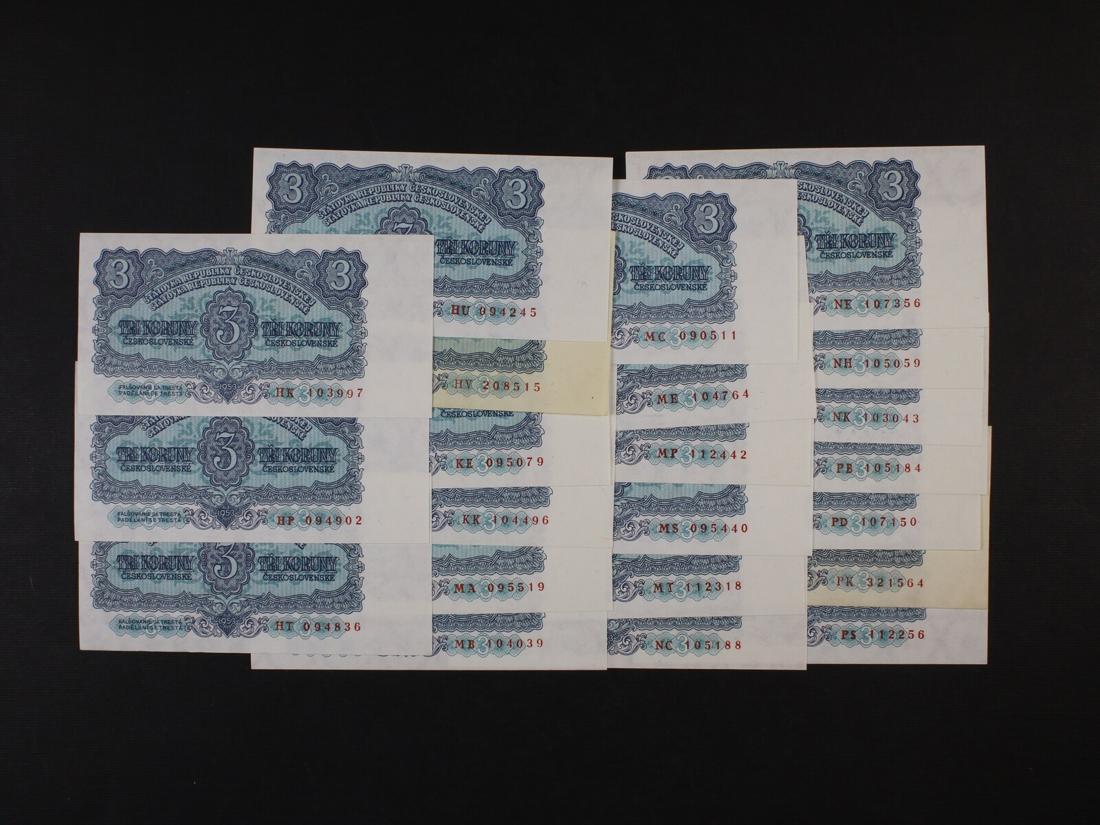 3 Kčs 1953 STC Praha série HK, HP, HT, HU, HV, KE, KK, MA, MB, MC, ME, MP, MS, MT, NC, NE, NH, NK, PB, PD, PK, PS, Ba. 87b, Pi. 79, 22 kusů