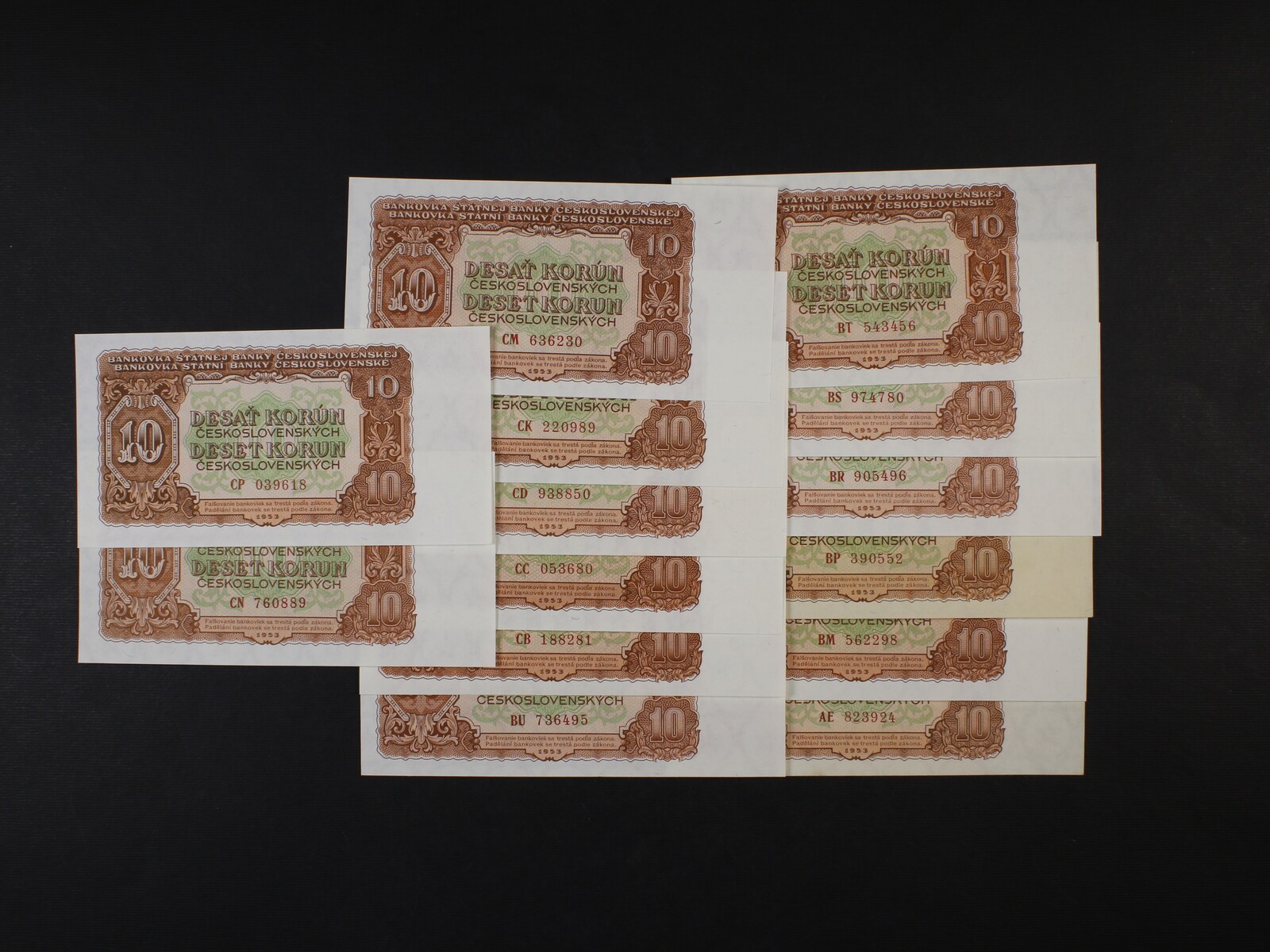10 Kčs 1953 Goznak Moskva série AE, BM, BP, BR, BS, BT, BU, CB, CC, CD, CK, CM, CN, CP, Ba. 89a, Pi. 81, 14 kusů