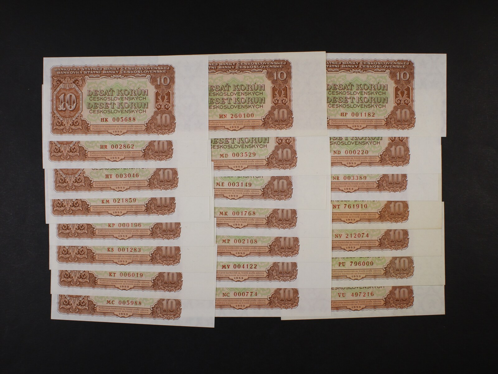10 Kčs 1953 STC Praha série HK, HN, HP, HR, HT, KM, KP, KS, KT, MC, MD, ME, MK, MP, MV, NC, ND, NR, NT, NV, PU, VU, Ba. 89b, Pi. 81, 22 kusů