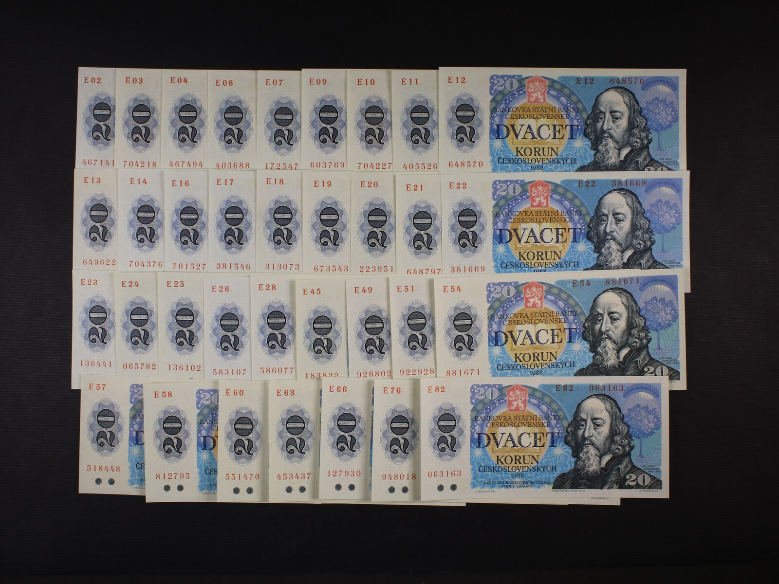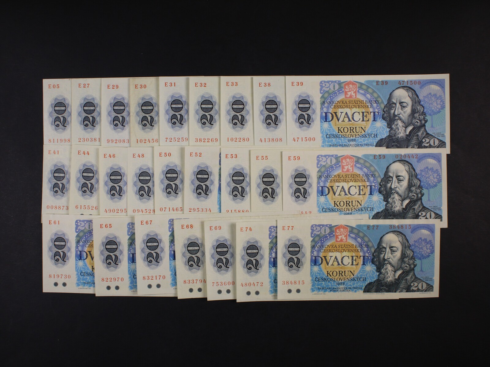 20 Kčs 1988 série E 02, 03, 04, 06, 07, 09, 10, 11, 12, 13, 14, 16, 17, 18, 19, 20, 21, 22, 23, 24, 25, 26, 28, 45, 49, 51, 54, 57, 58, 60, 63, 66, 76, 82, Ba. 105, Pi. 95a, 34 kusů